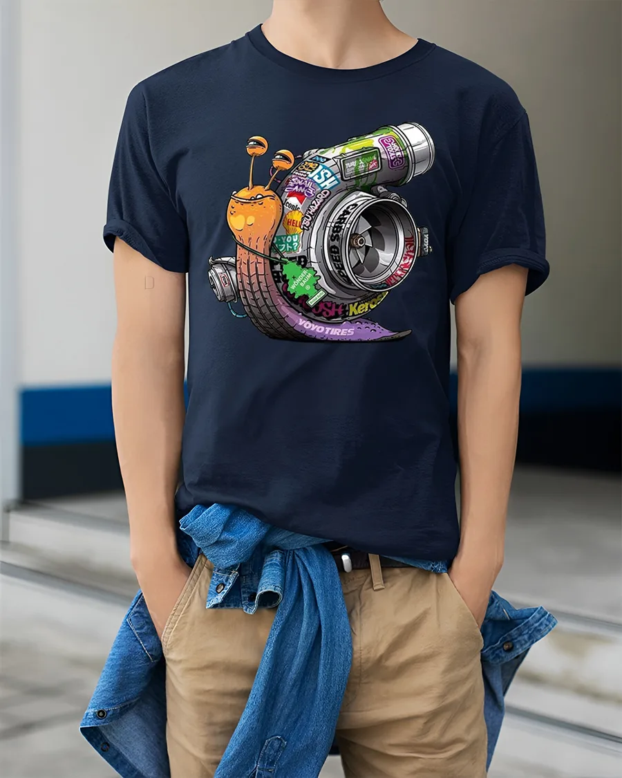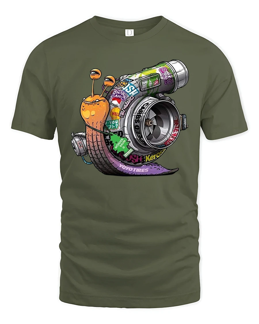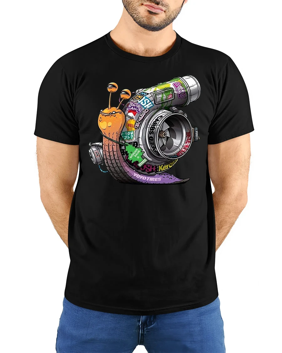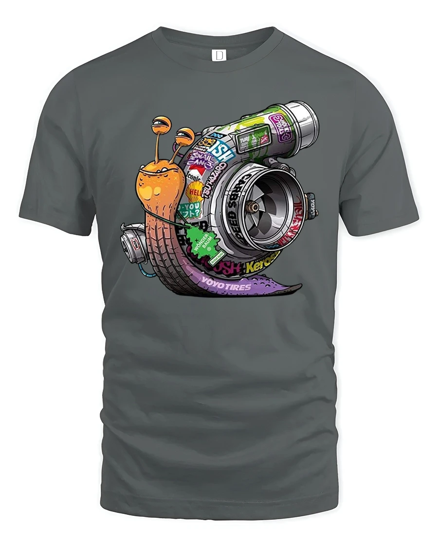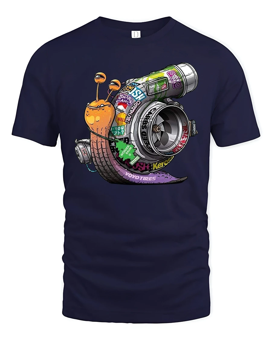 The funny turbo snail graphic t shirt combines humor and speed in a creative automotive inspired design.
