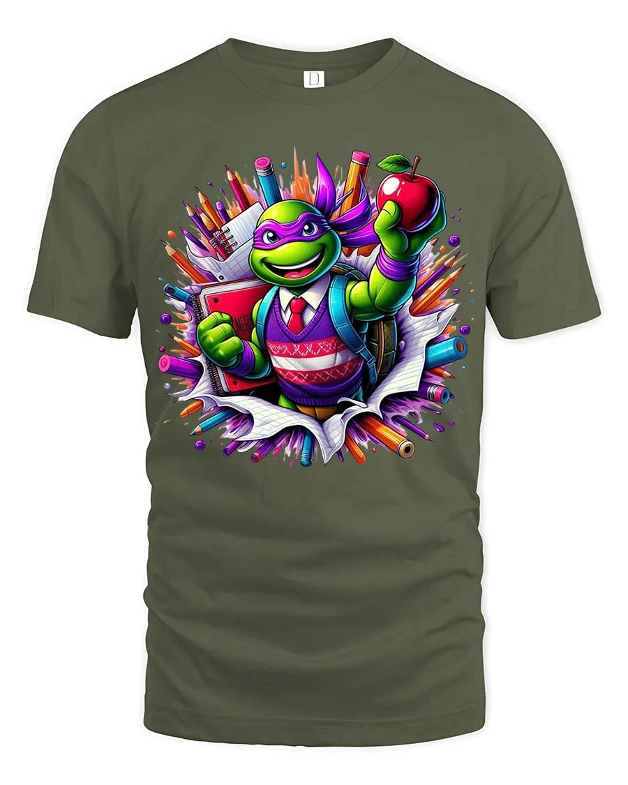 The vibrant illustration captures the excitement of learning and creativity while adding a humorous twist with the friendly turtle student. The colorful burst of school supplies makes the design lively and eye-catching, perfect for classrooms, school events, or casual everyday outfits.