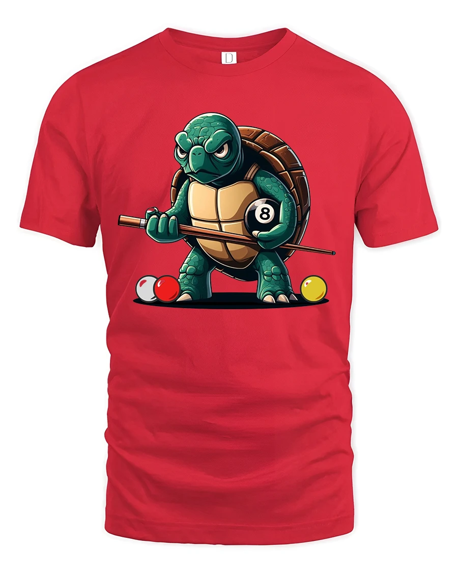 Funny Turtle Pool Shark Eight Ball Billiards Graphic Tee Shirt - red t-shirt on white background