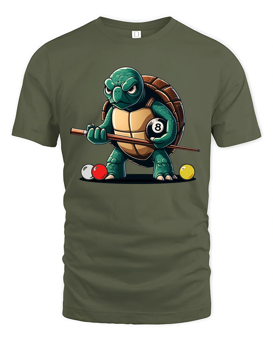 Funny Turtle Pool Shark Eight Ball Billiards Graphic Tee Shirt - military green t-shirt on white background