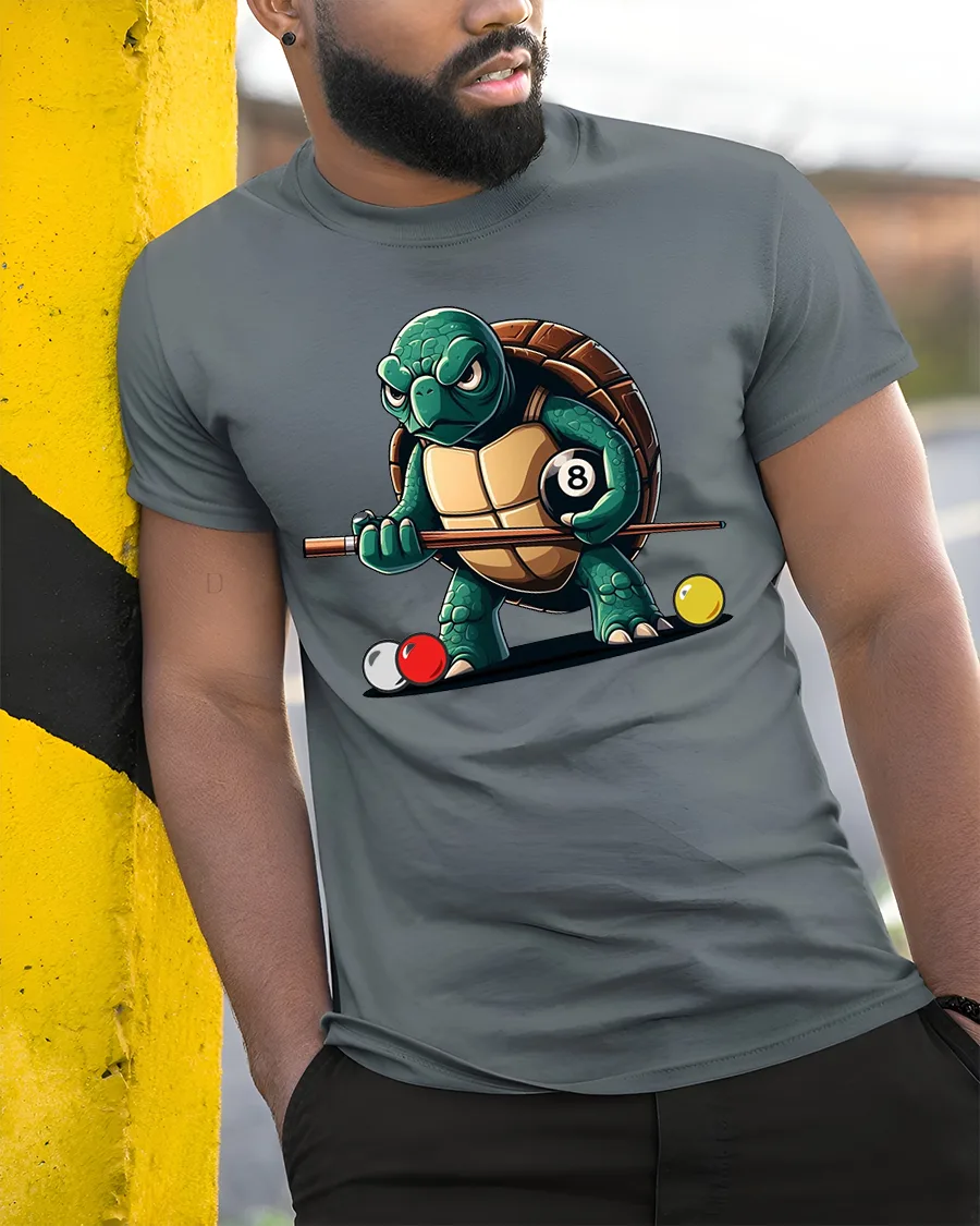 Funny Turtle Pool Shark Eight Ball Billiards Graphic Tee Shirt brings humor and personality to classic game night style.