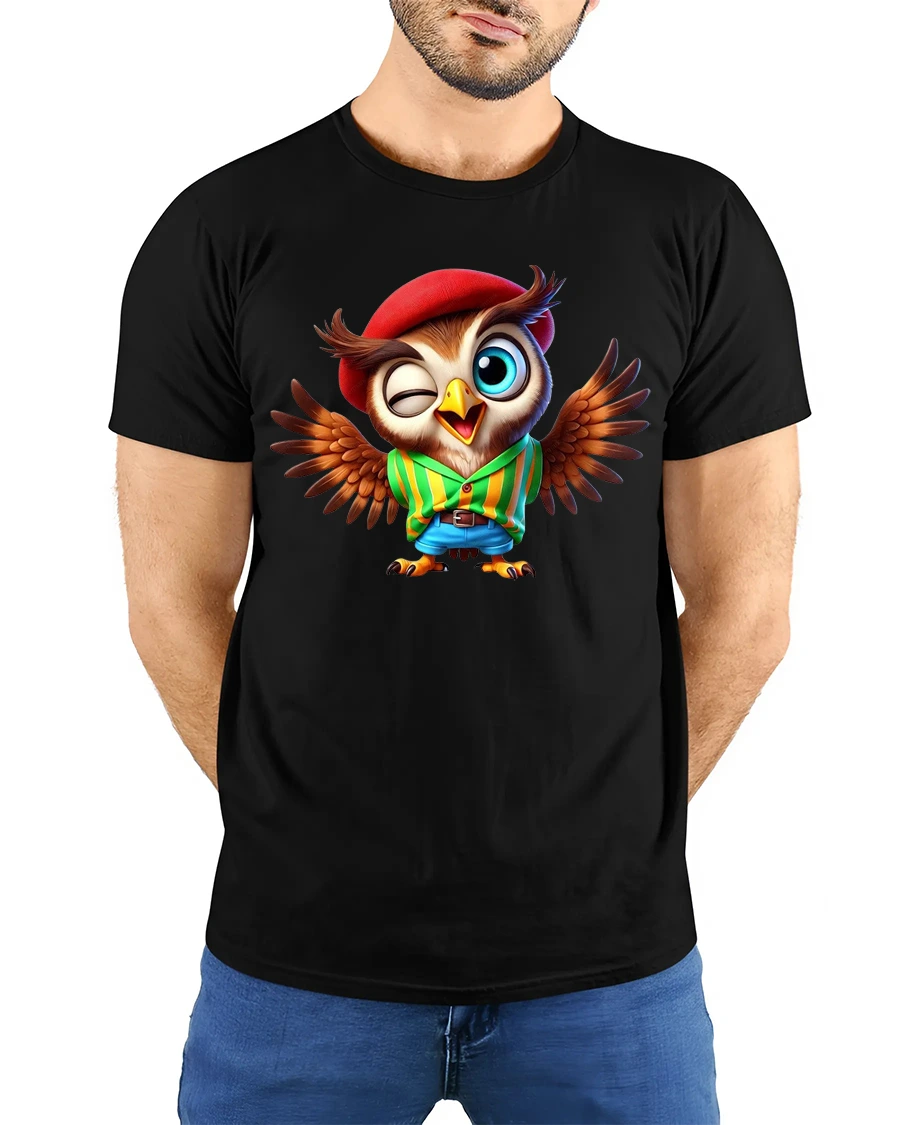 The design features an expressive owl winking happily with open wings a stylish hat and a cheerful pose.