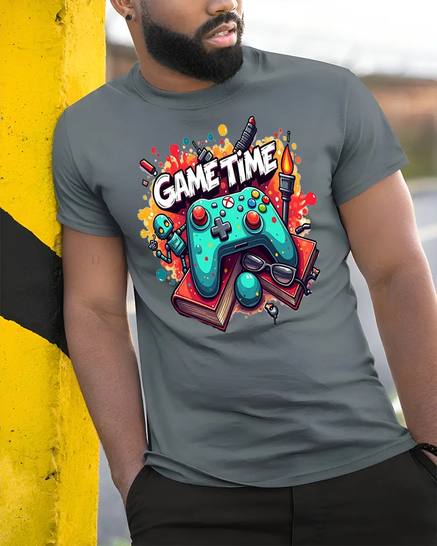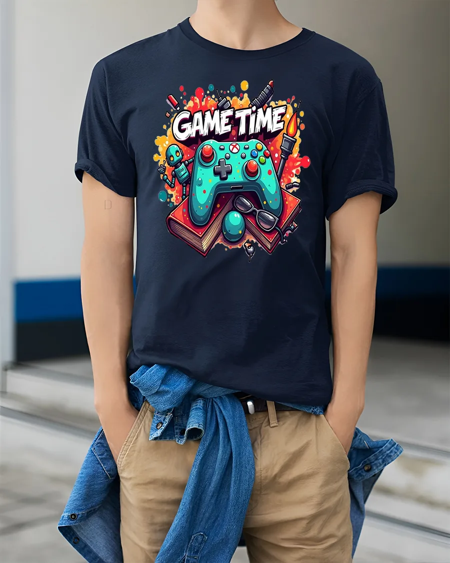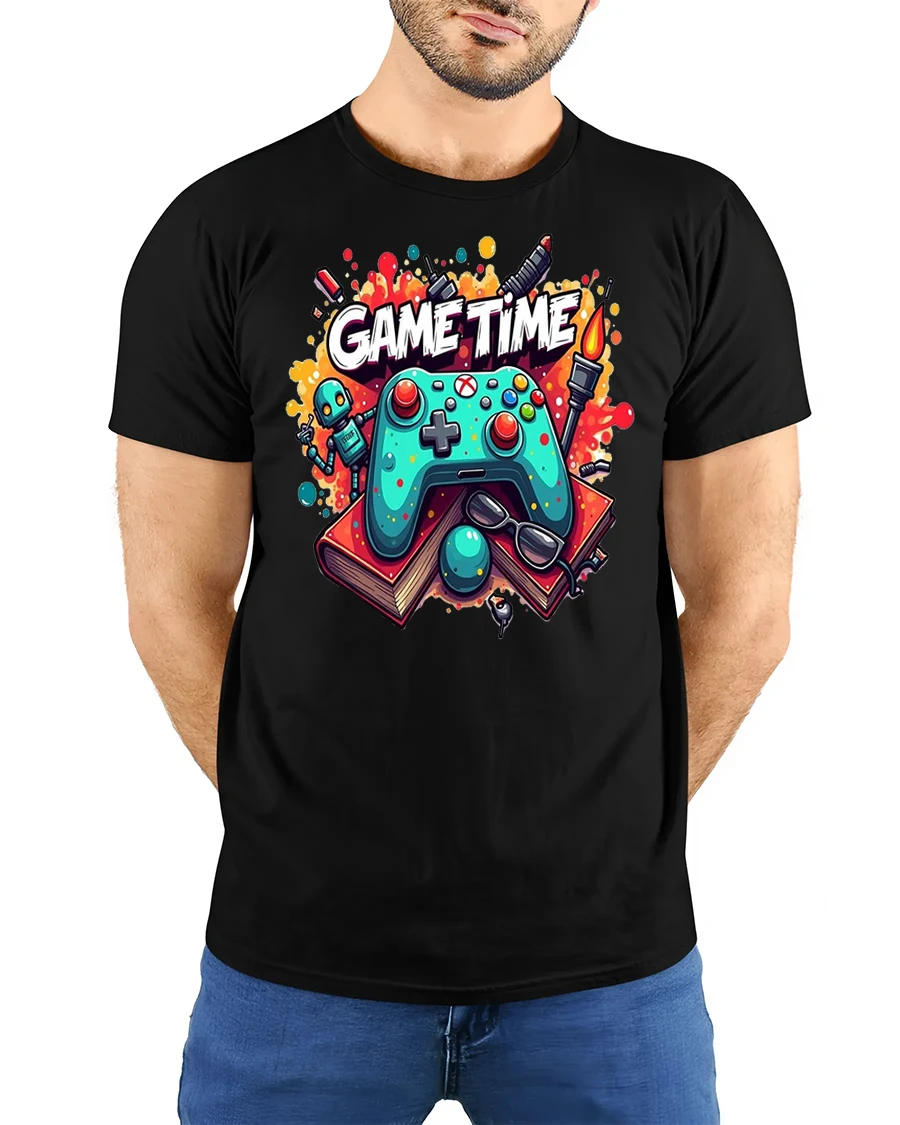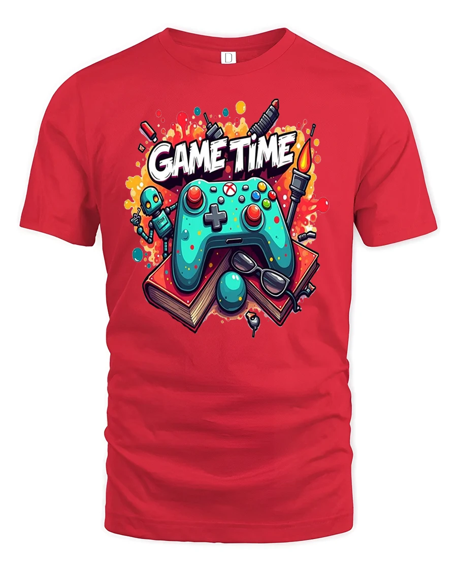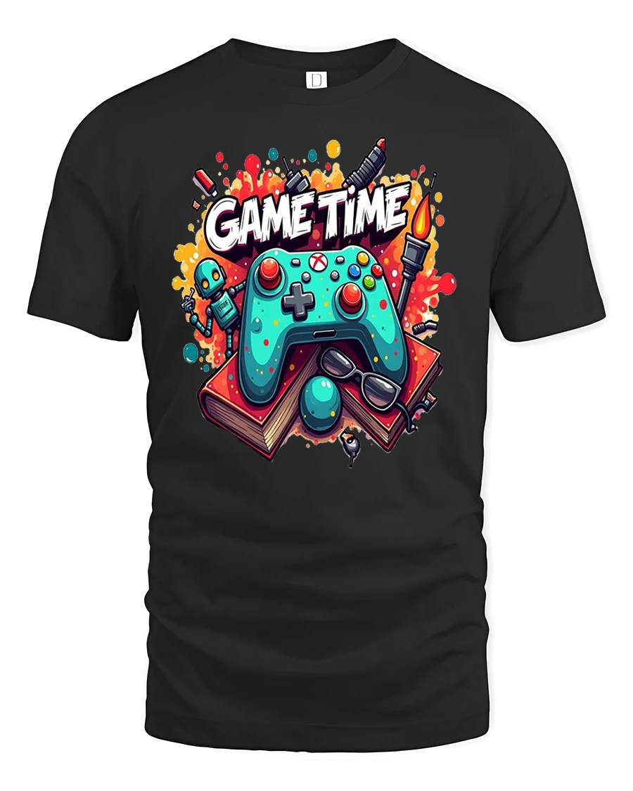 Featuring a vibrant game controller surrounded by creative splashes of color, this tee captures the fun and excitement of every “Game Time” moment.