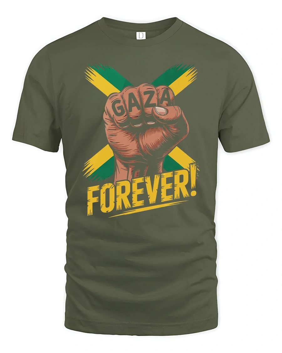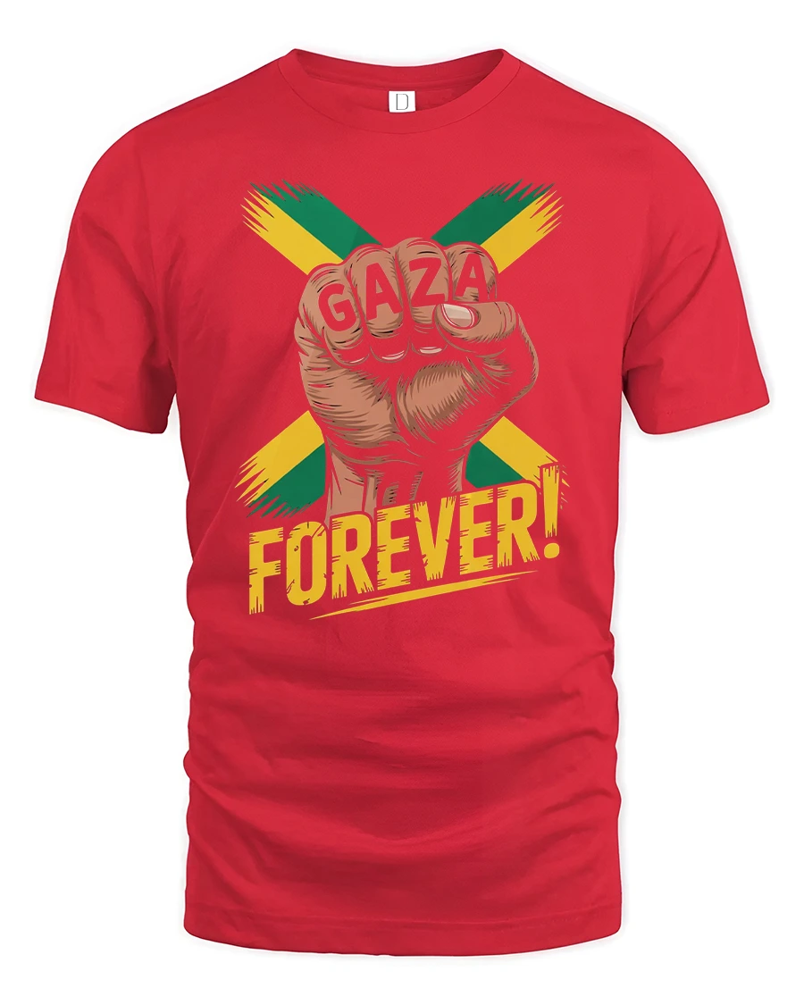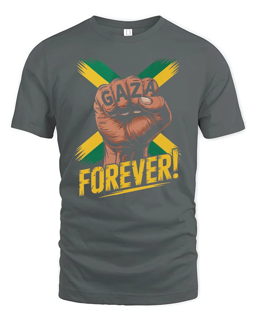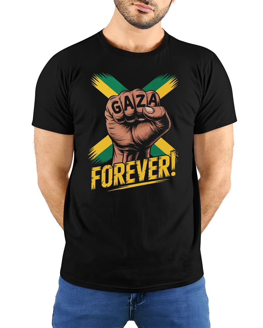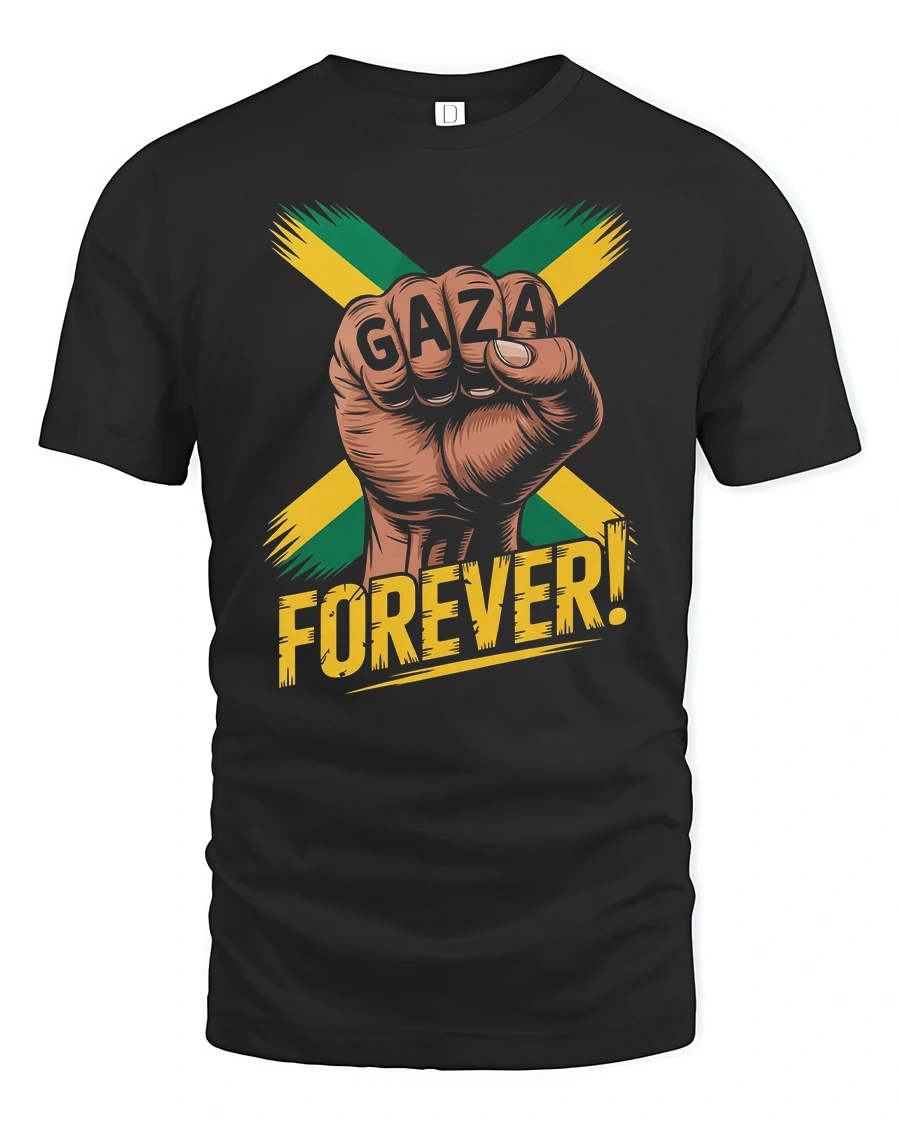 Featuring a powerful raised fist design with bold “Gaza Forever” lettering and a reggae-inspired backdrop, this tee represents courage and solidarity through art and style.