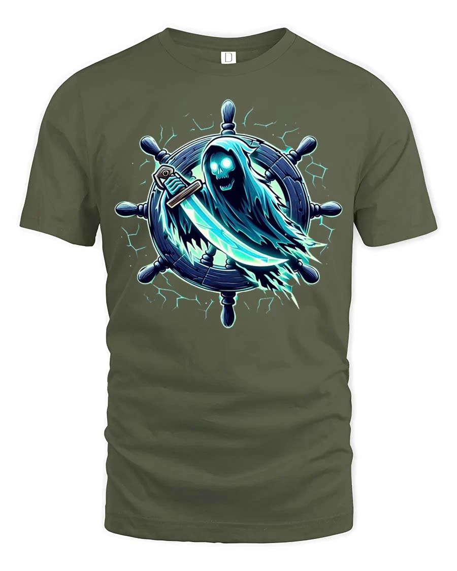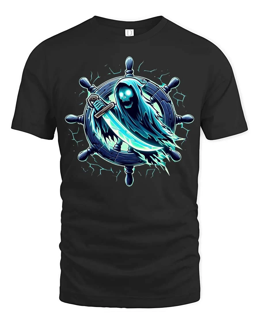 The Ghost Pirate Reaper Graphic T-Shirt features a haunting design of a spectral reaper emerging from a pirate ship wheel with a glowing blade.