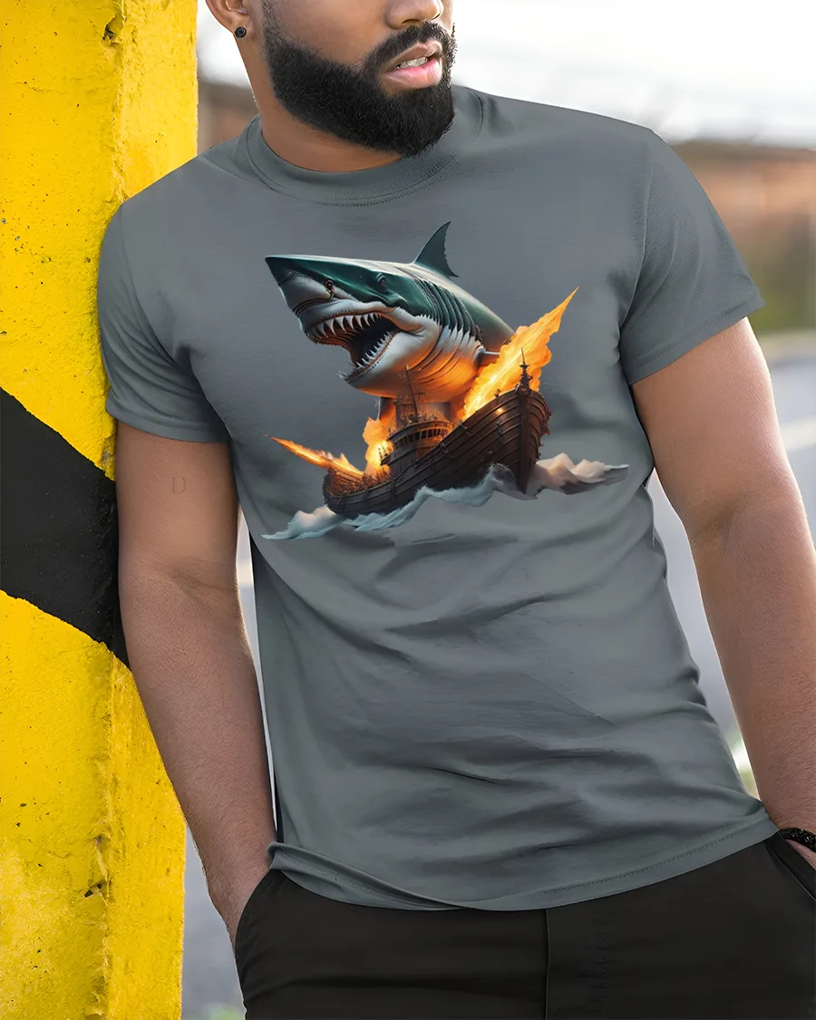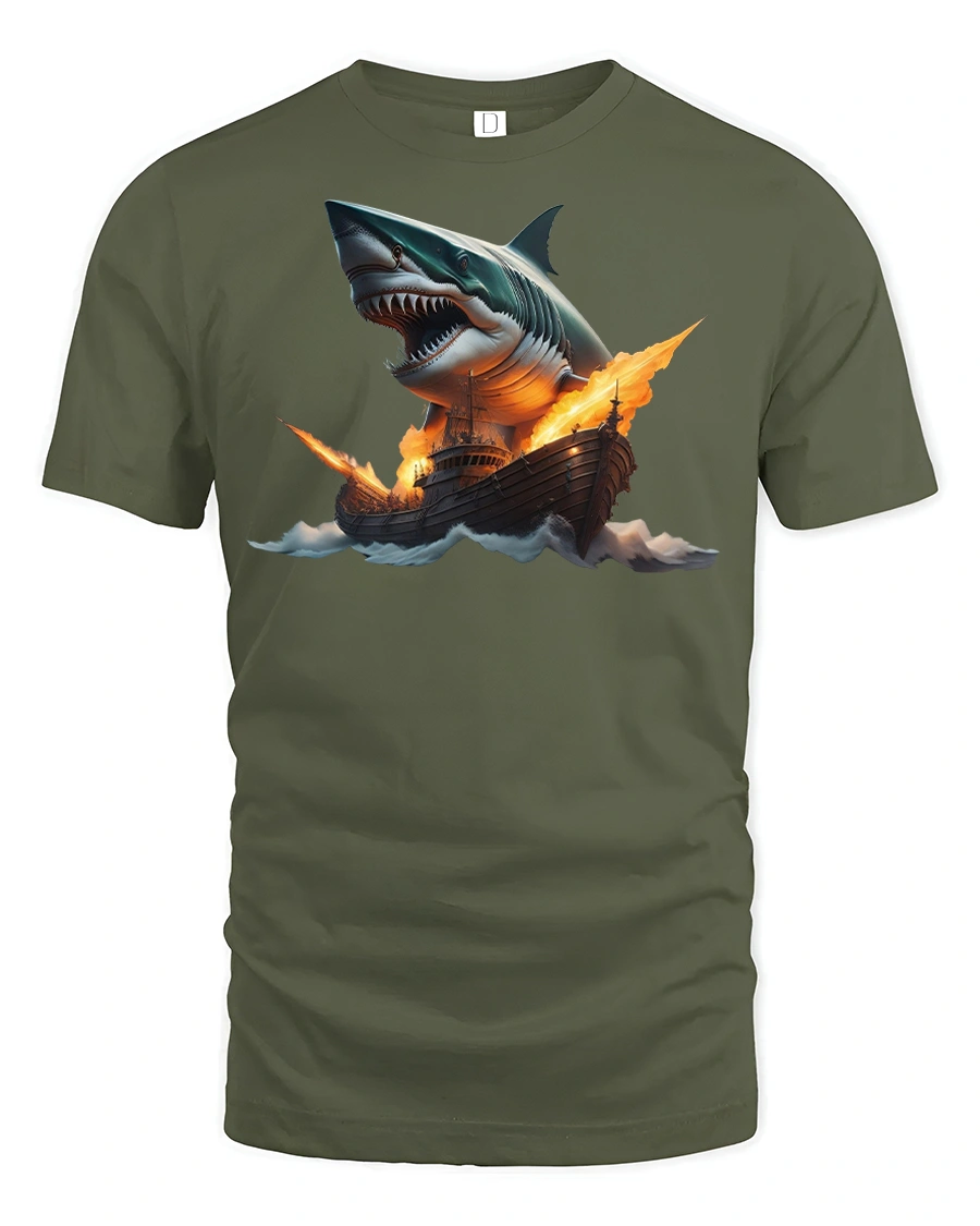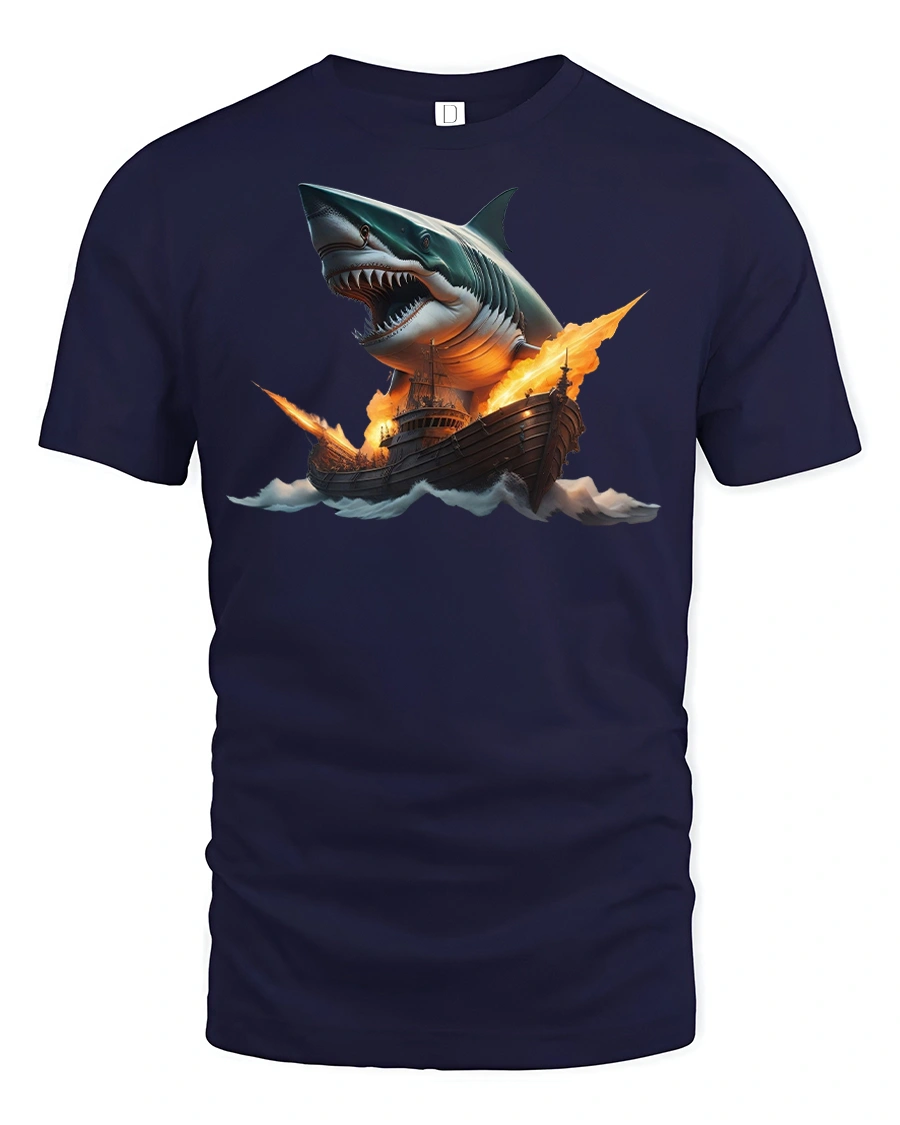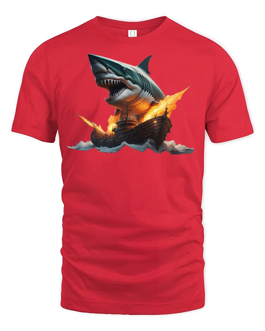 Giant Shark vs Warship Epic Battle Graphic T-shirt brings explosive ocean action straight to your wardrobe. Featuring a massive shark leaping over a burning warship, this design captures the intensity of a nautical showdown like no other. The fiery details and powerful imagery make this tee a bold statement piece for anyone who loves marine predators, fantasy art, or adrenaline-fueled designs.