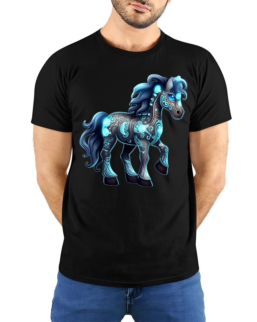 Glowing Fantasy Horse Graphic Tshirt Mystical Neon Art Tee pairs effortlessly with jeans leggings or relaxed streetwear looks.