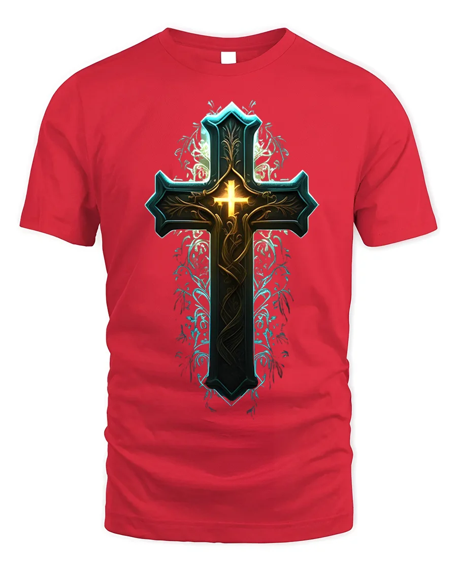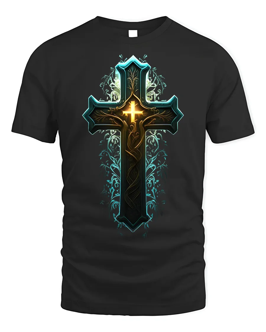 This profound tee features a beautifully detailed, ornate cross design with a captivating glowing effect, symbolizing divine light and hope.