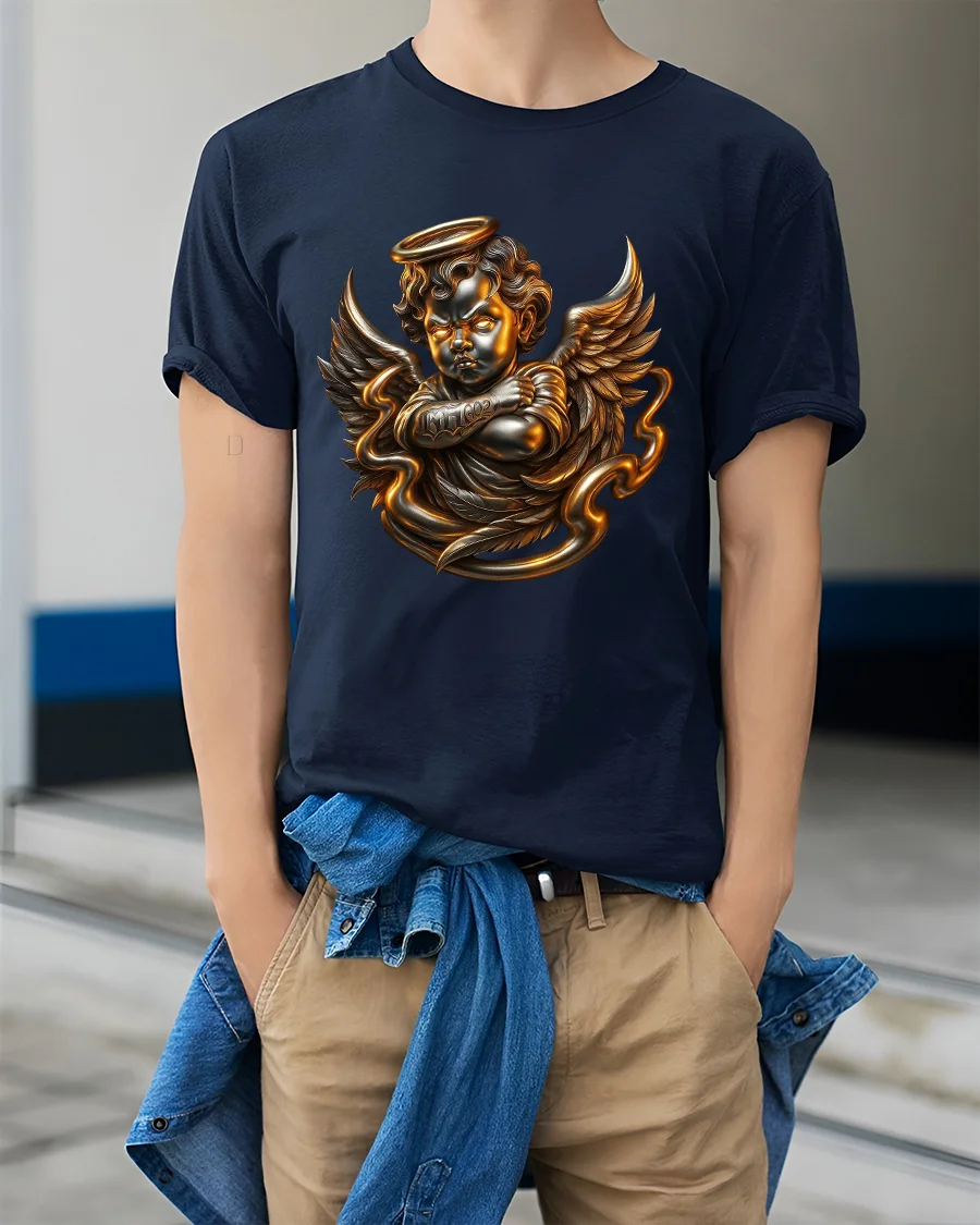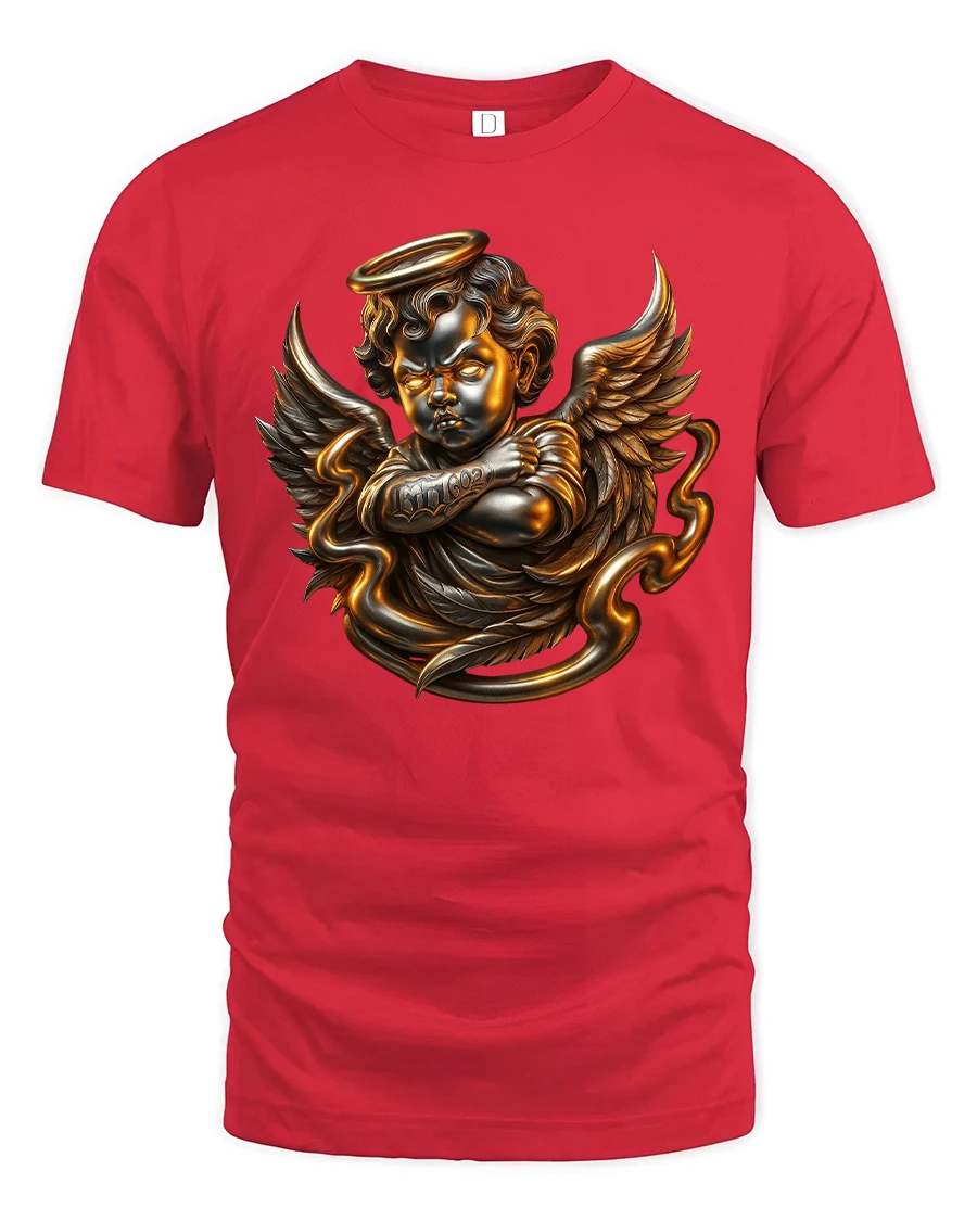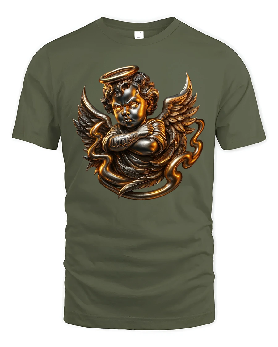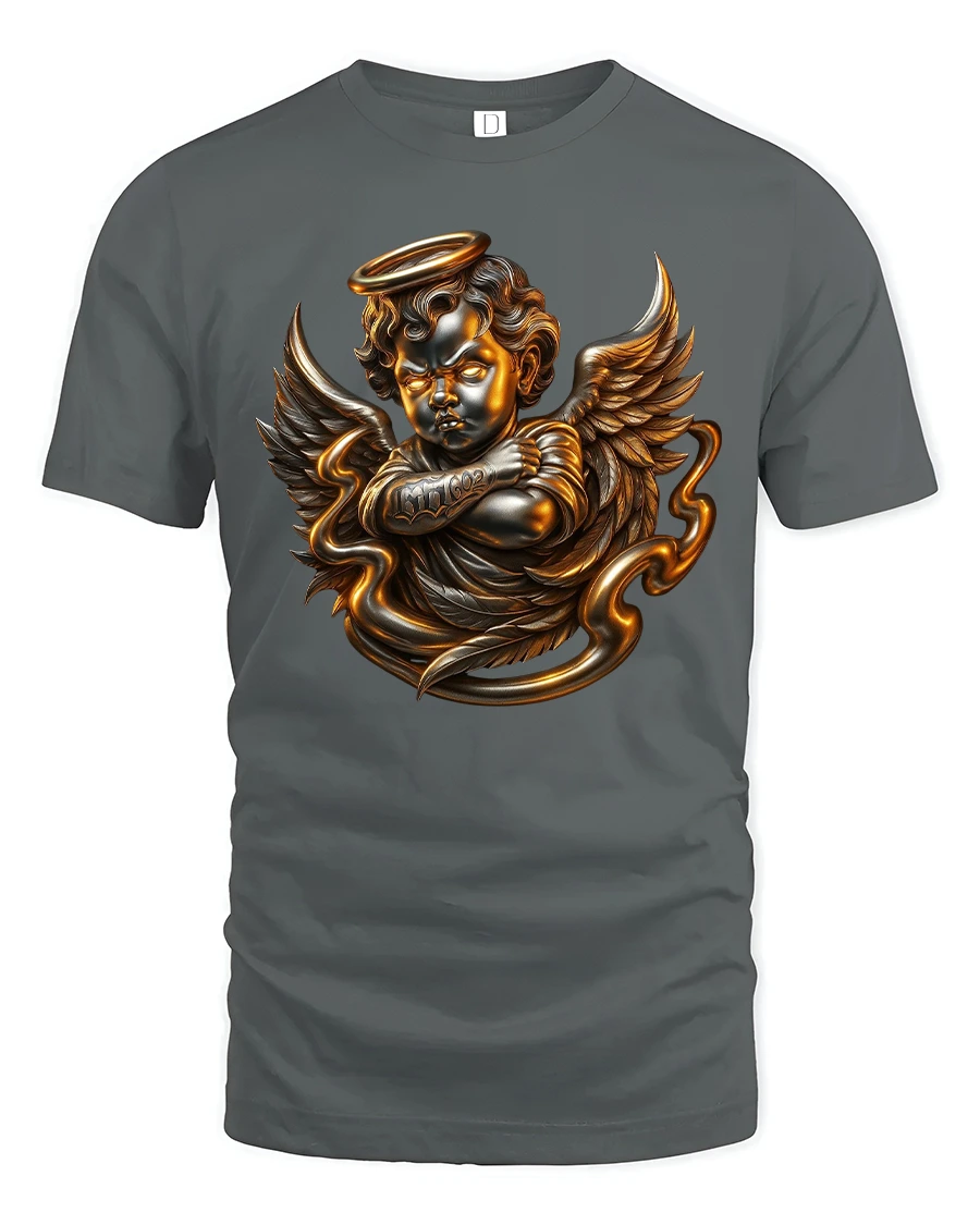 Make a bold artistic statement with this Golden Angel Cherub T Shirt Dark Gothic Art Graphic Tee. The design features a striking cherub with detailed wings, a glowing halo, and intense expression rendered in rich golden tones. Inspired by baroque sculpture and dramatic fantasy art, this powerful image blends heavenly symbolism with edgy modern style, creating a captivating and unforgettable look.