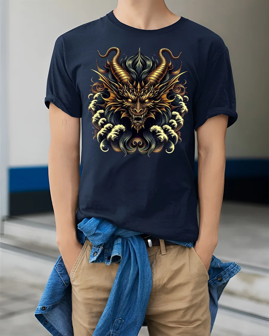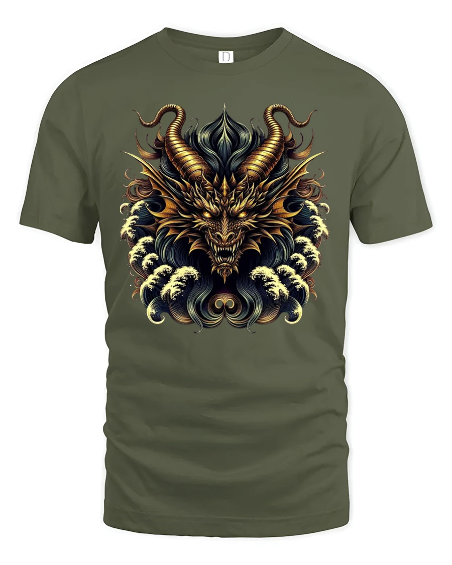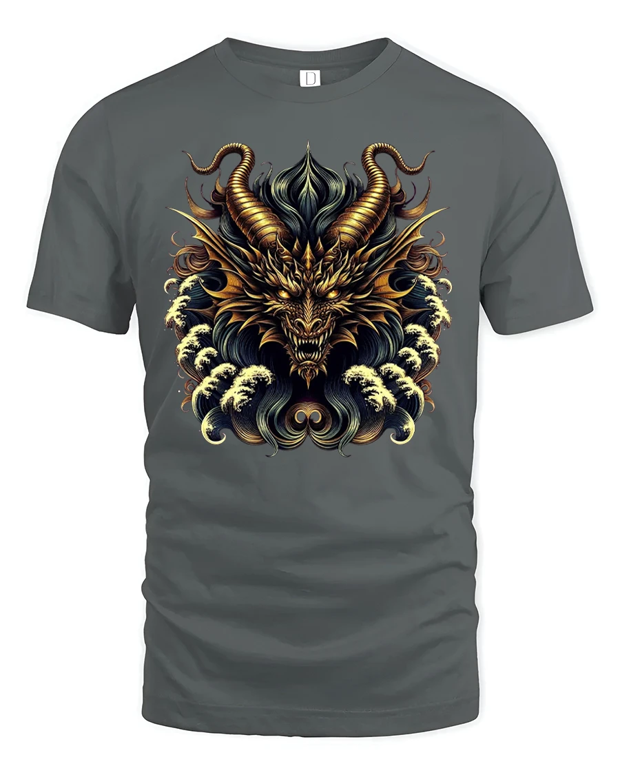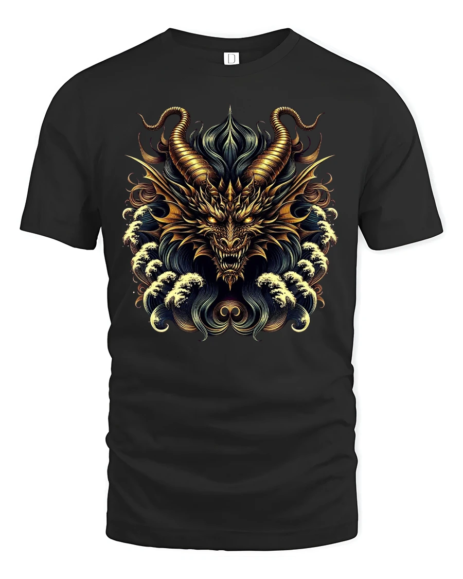 Featuring an epic design of a golden-horned dragon rising from waves, this tee captures strength, wisdom, and ancient legend in stunning detail.