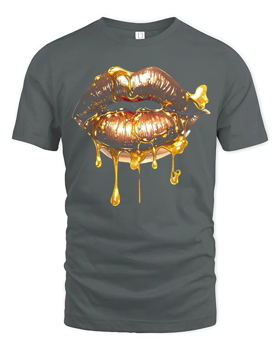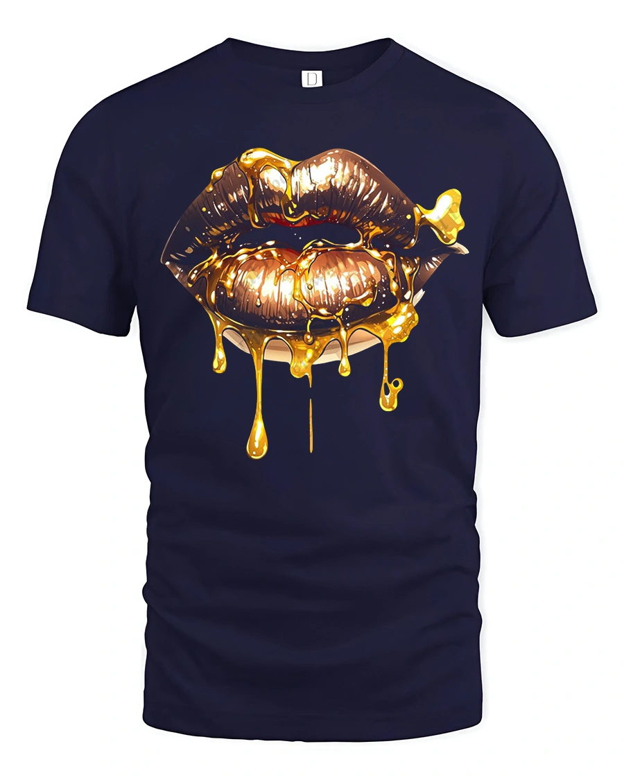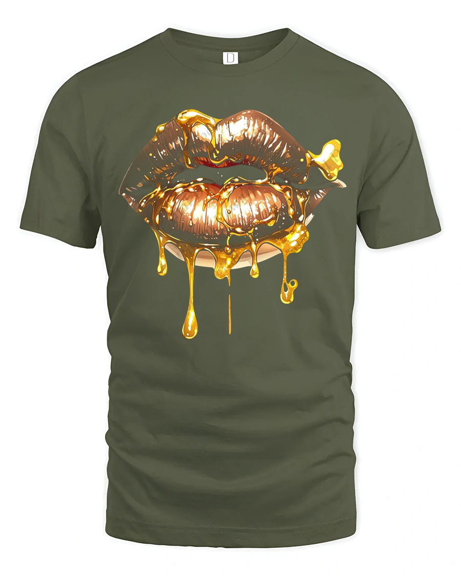Golden Dripping Lips Graphic Tee delivers a bold and glamorous statement with a striking illustration of glossy lips dripping in radiant gold.