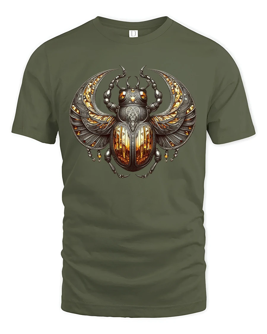 Featuring a stunning metallic beetle adorned with glowing golden wings, this design symbolizes rebirth, protection, and eternal energy.