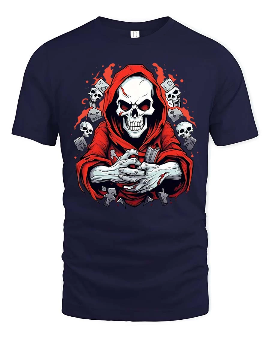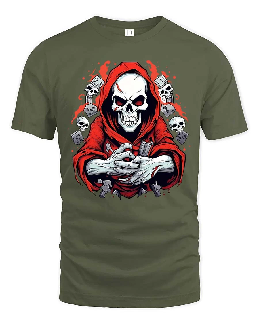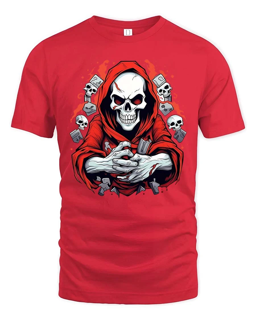 Featuring a detailed skull reaper in a striking red hood surrounded by eerie elements, this tee delivers a powerful and mysterious vibe.