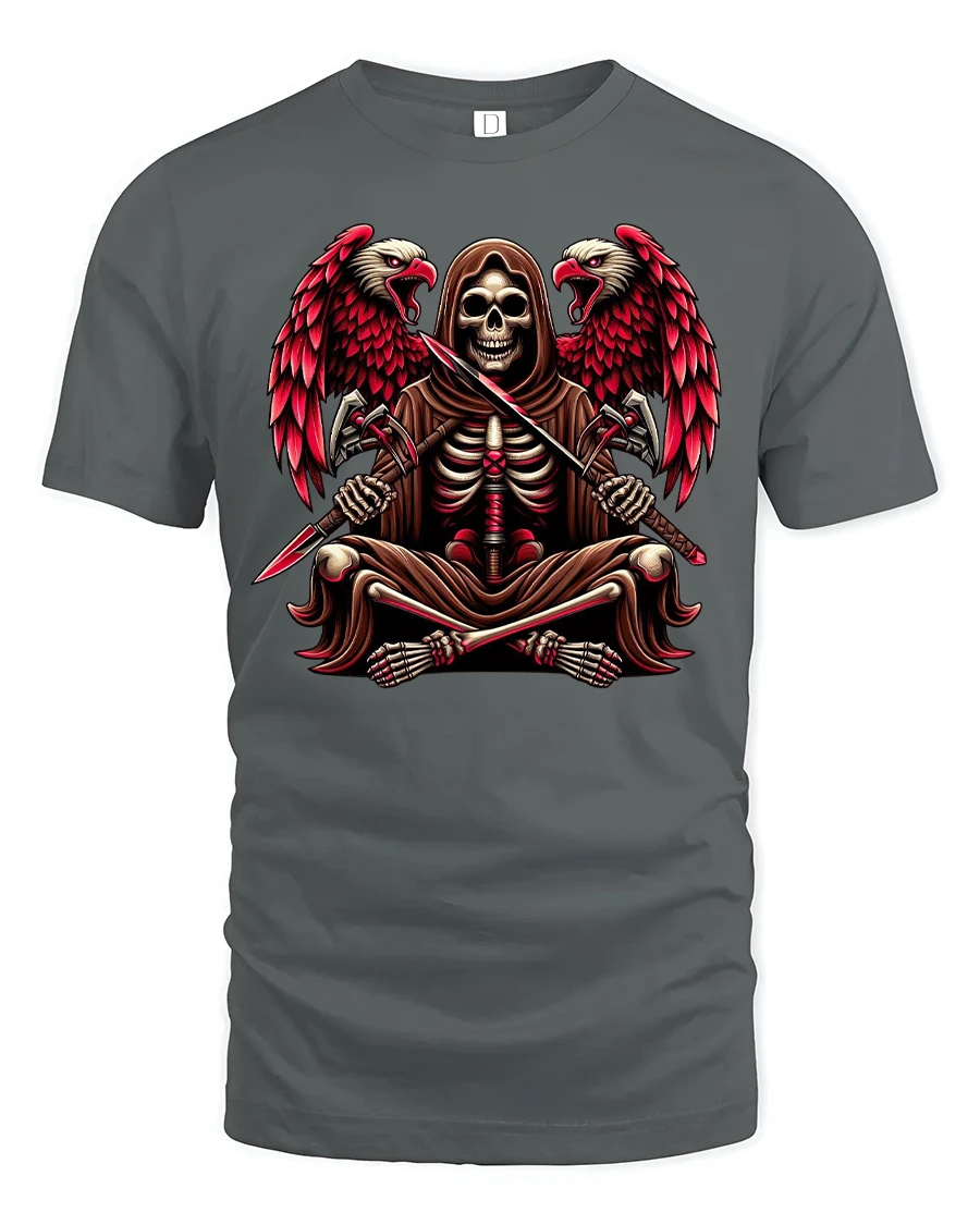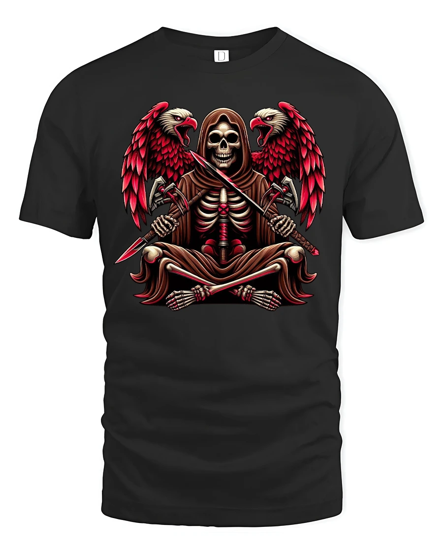 The design features a menacing reaper seated in calm power, flanked by two fierce eagles with blood-red wings — a perfect mix of strength and mystery.