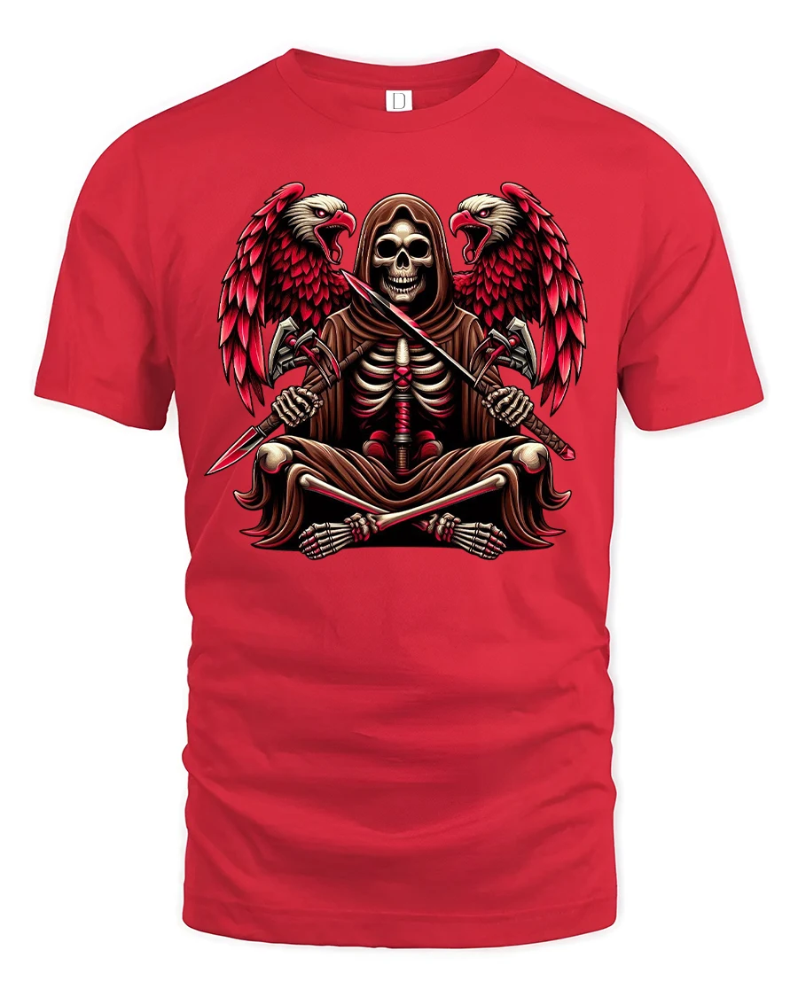 Grim Reaper Twin Eagle Warrior Graphic T-Shirt - red t-shirt on white background