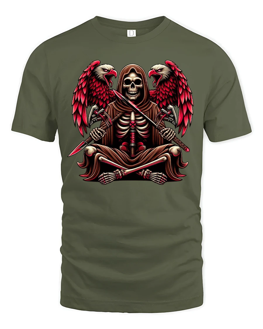 Embrace the power of darkness with this Grim Reaper Twin Eagle Warrior Graphic T-Shirt, a bold statement piece for gothic and horror lovers.