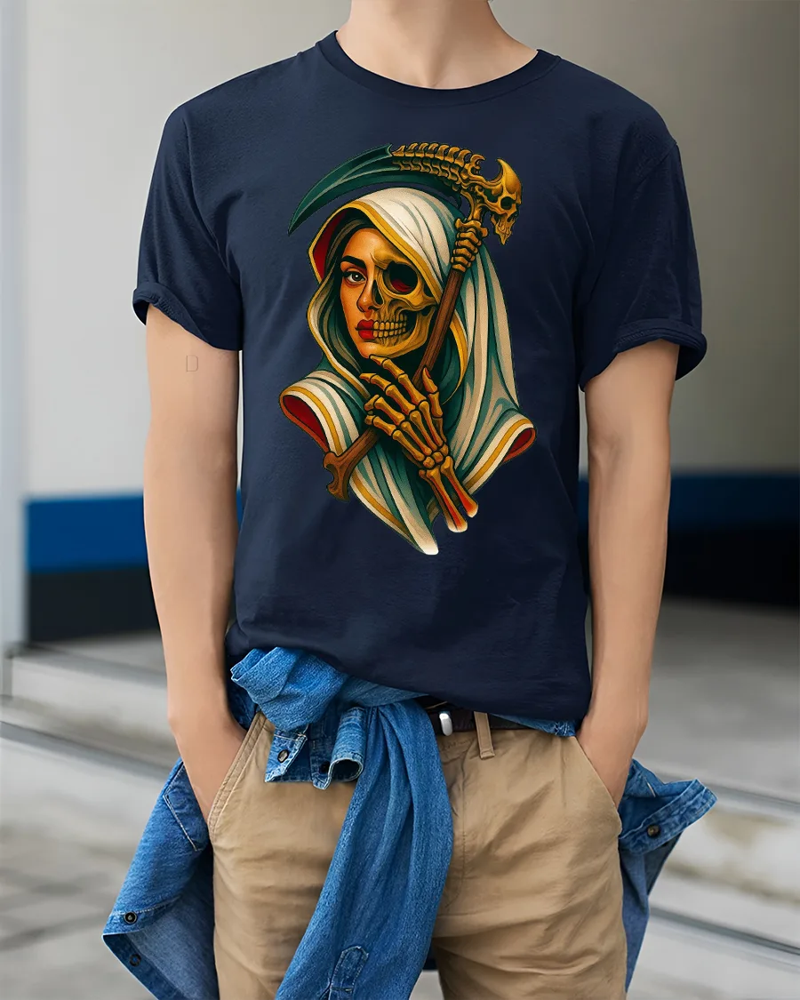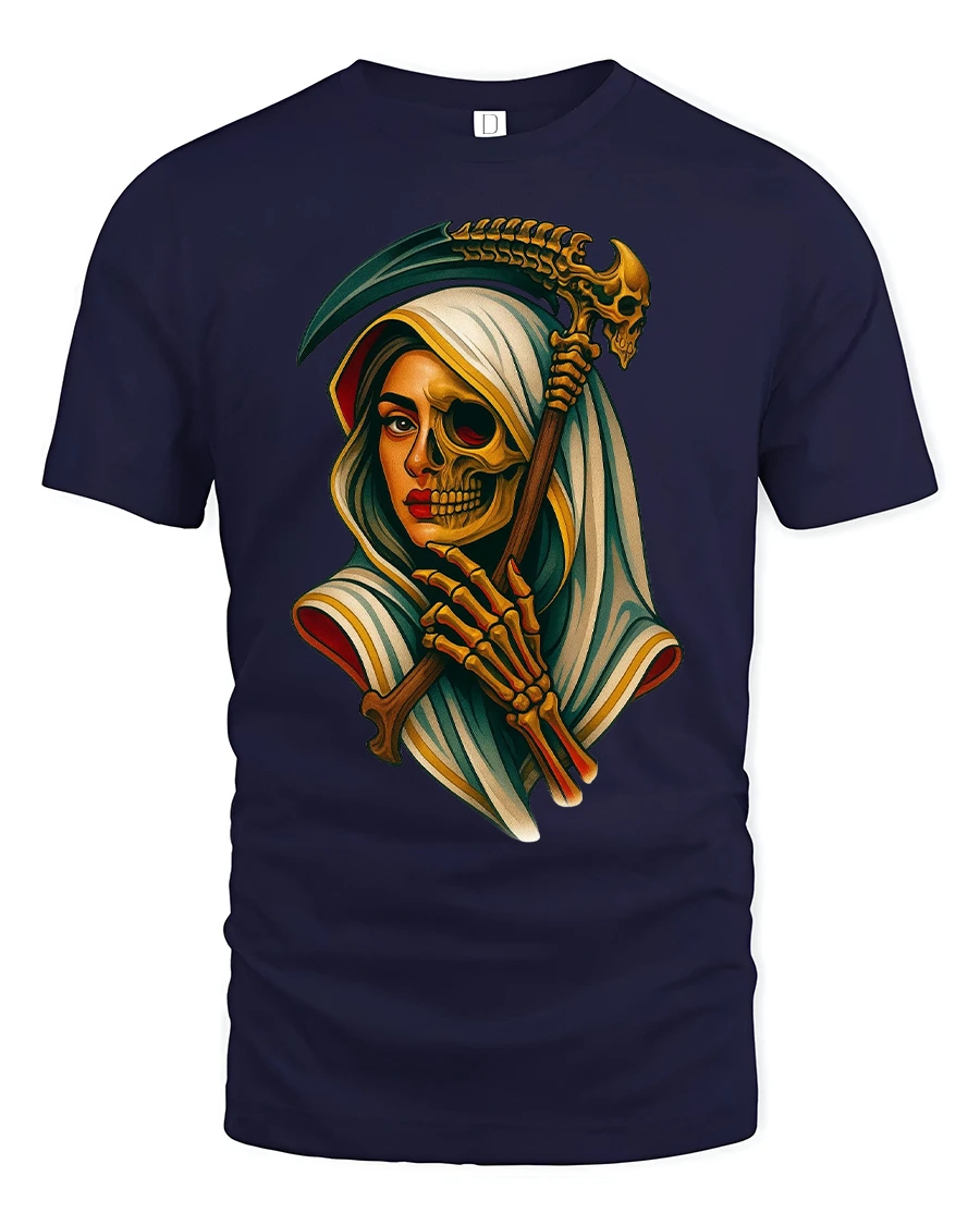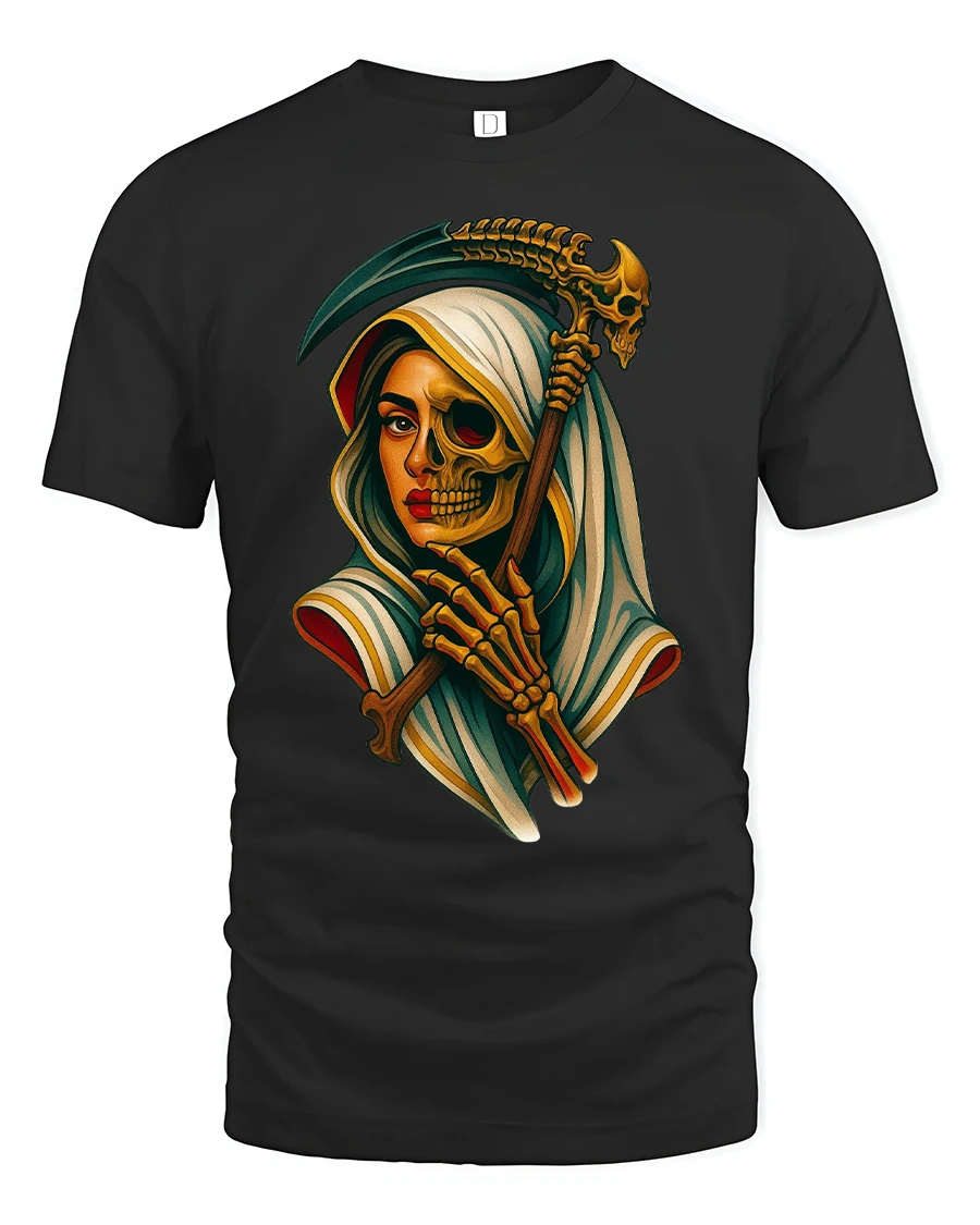 Featuring a detailed design of a woman merging with a skeleton reaper, the artwork captures both grace and darkness in perfect balance.
