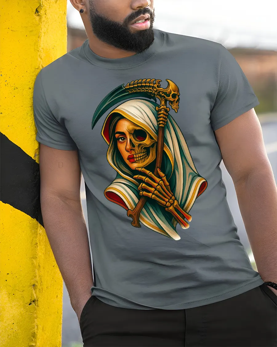 Embrace the dark beauty of life and death with this Grim Reaper Woman Half Skull Gothic Art T-Shirt, a hauntingly elegant blend of mystery and power.