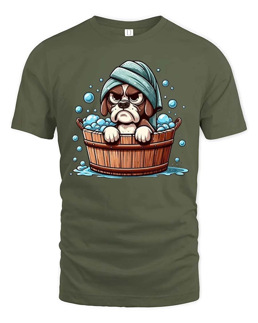 Bring humor to your wardrobe with the Grumpy Dog Bath T-Shirt, featuring a funny cartoon puppy sitting in a wooden tub full of bubbles with an adorable grumpy expression.