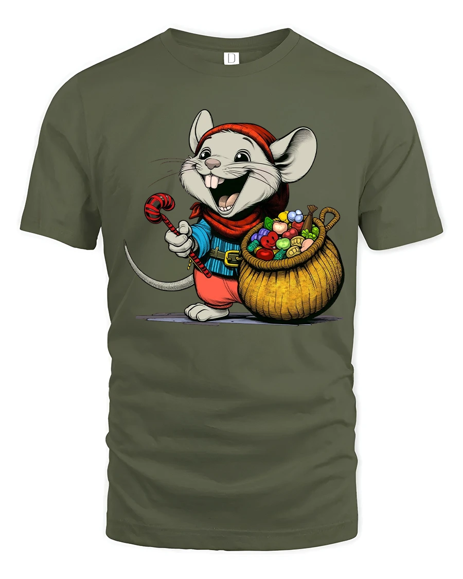 Happy Cartoon Mouse Candy Collector Art Tee Cute Graphic TShirt - military green t-shirt on white background