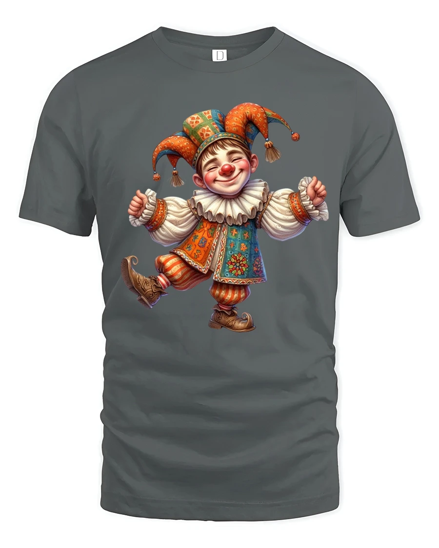 The Happy Jester Clown Character Graphic Tee Whimsical Art Tshirt is ideal for those who enjoy fantasy humor and artistic designs.