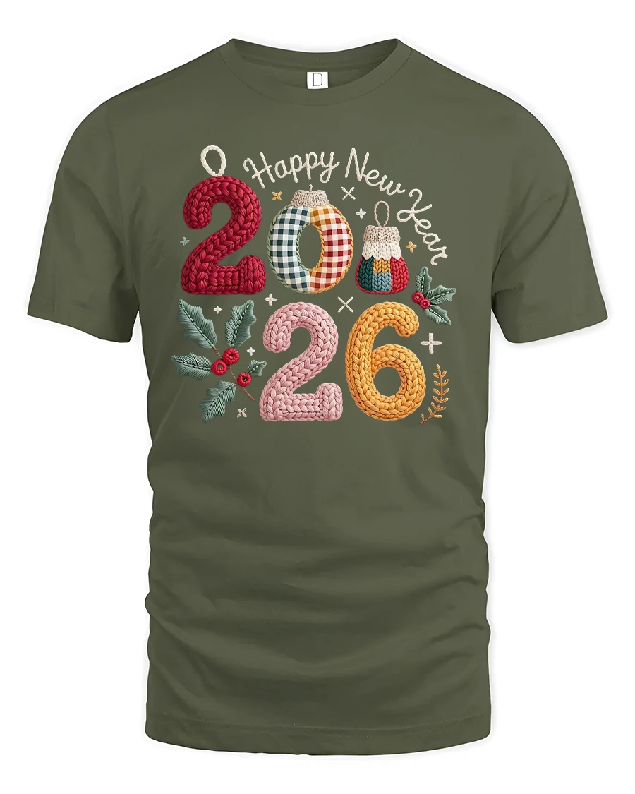 Happy New Year 2026 Knitted Numbers Graphic T Shirt Cozy Festive Tee - military green t-shirt on white background