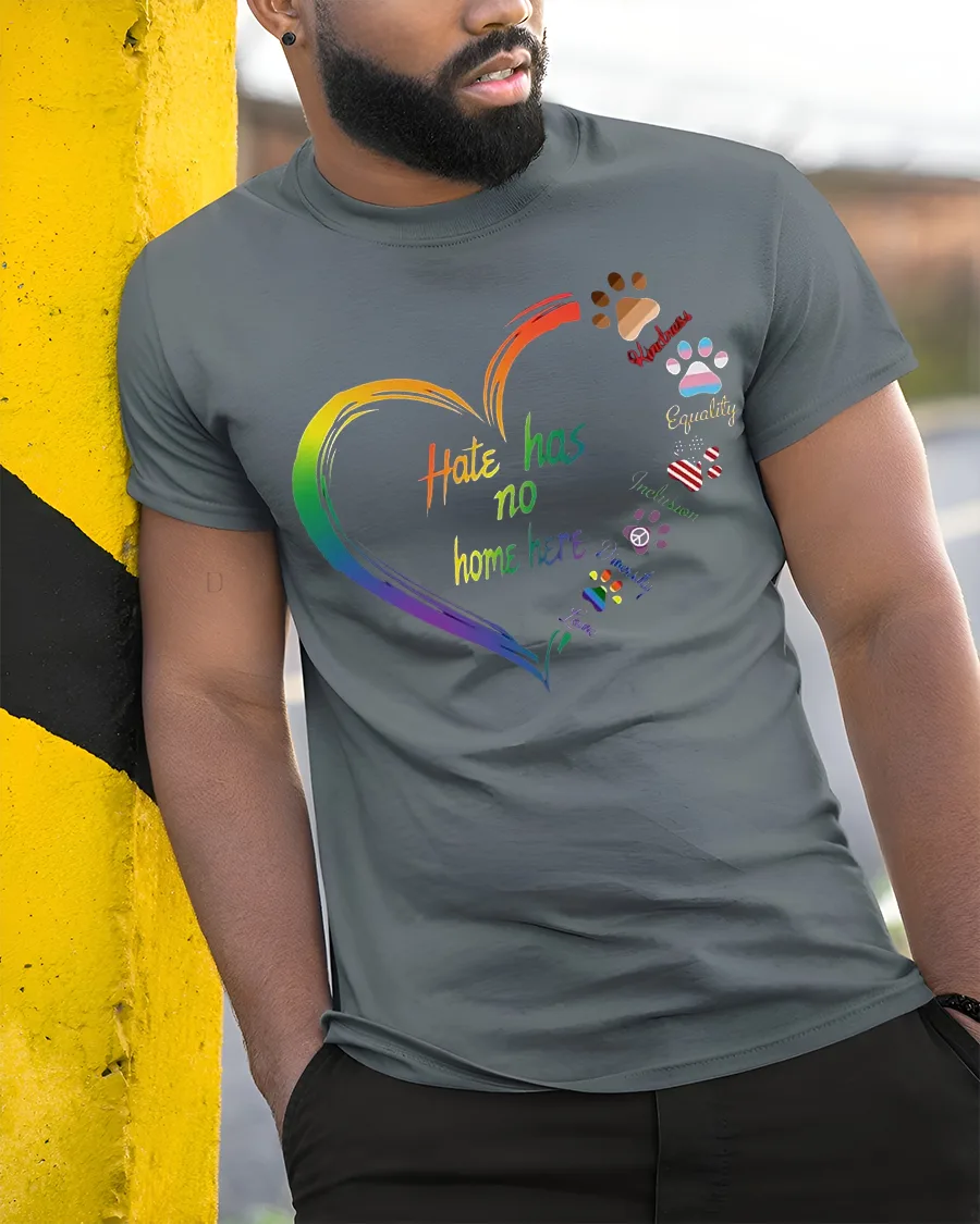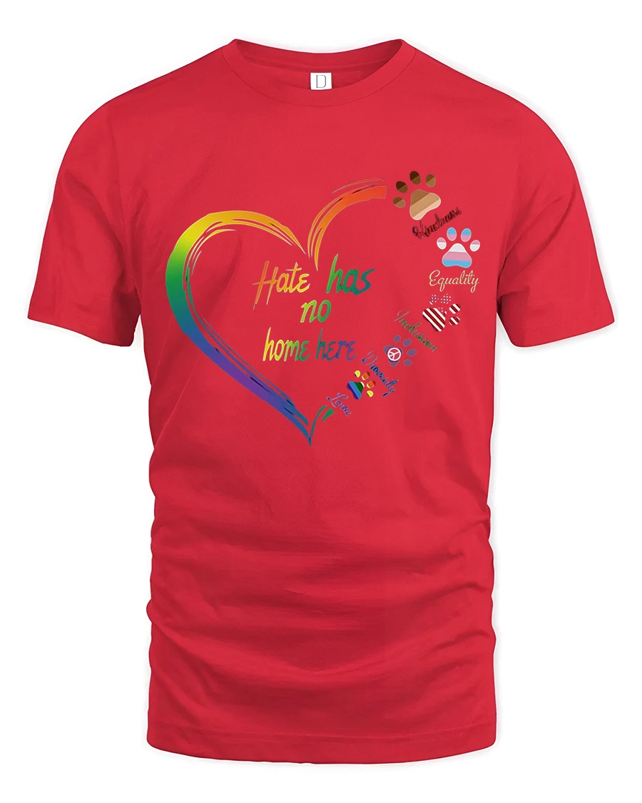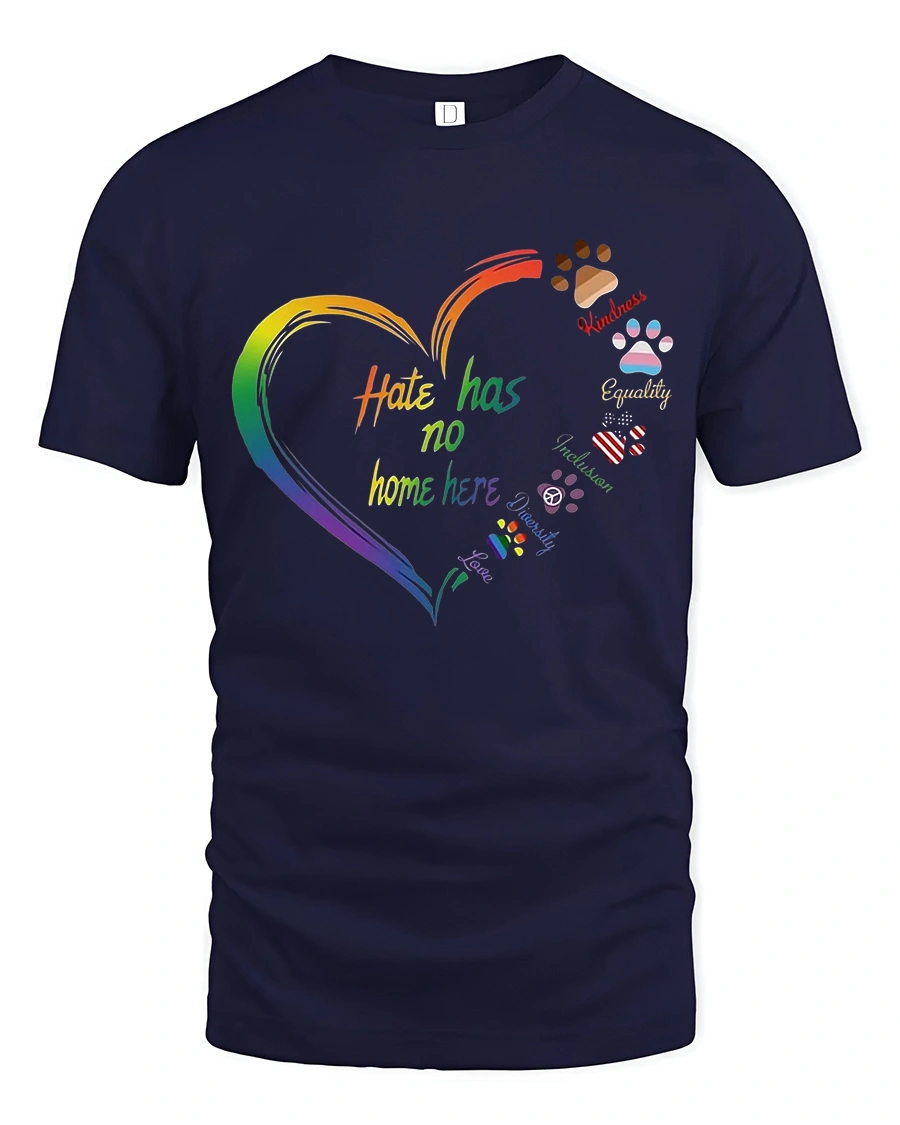 Hate Has No Home Here Rainbow Heart Unity Graphic Tee Tshirt shares a powerful message through a vibrant and uplifting design.