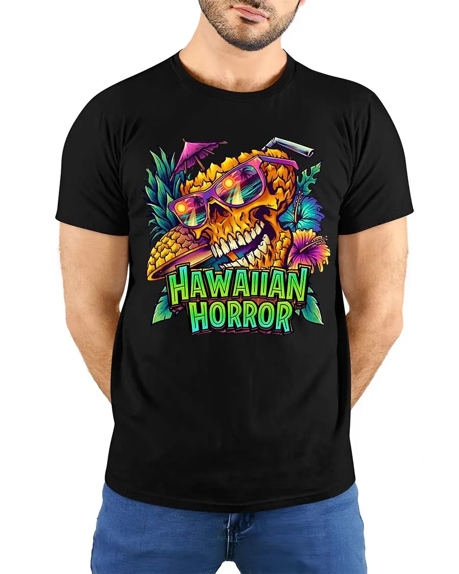 Hawaiian Horror Skull Tropical Neon Graphic Style T-Shirt is an excellent option for individuals who appreciate bold creative themes.