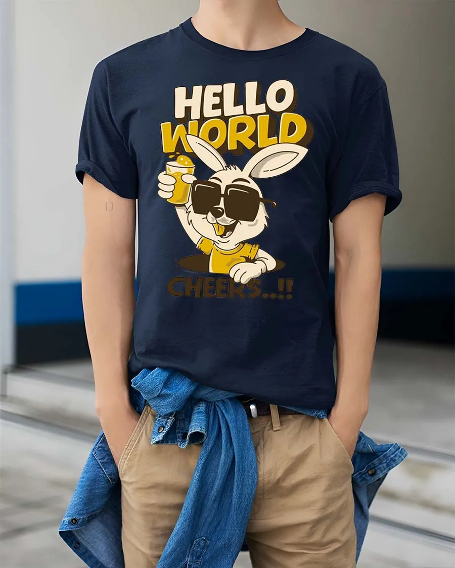 Hello World Cheers Rabbit Funny Party Graphic Cool T-Shirt - model wearing navy tee with hands in pockets