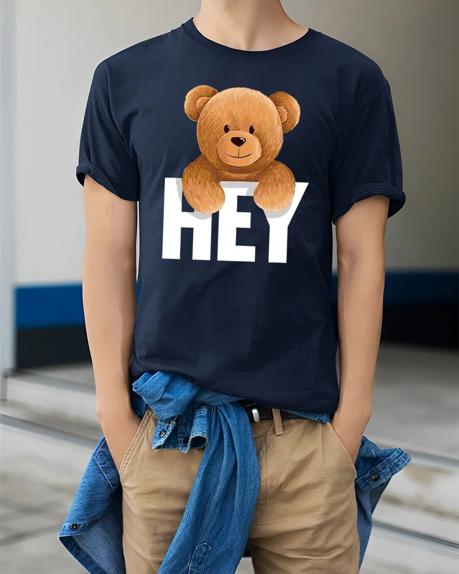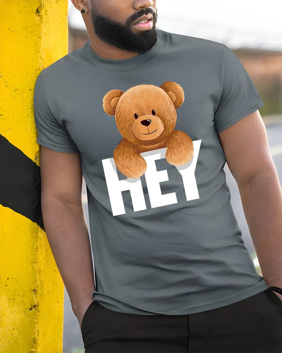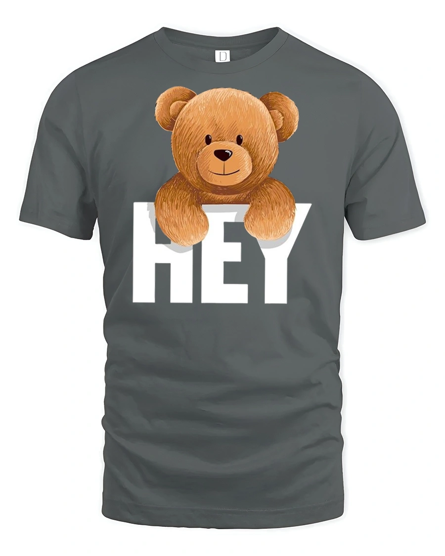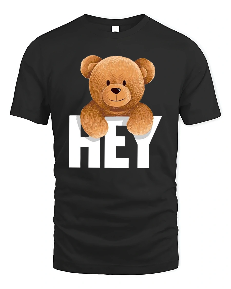 Featuring an adorable teddy bear leaning over the bold word “HEY,” this tee captures the playful side of fashion with a fun, friendly vibe.