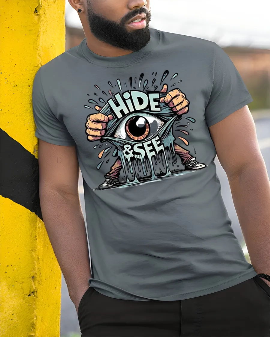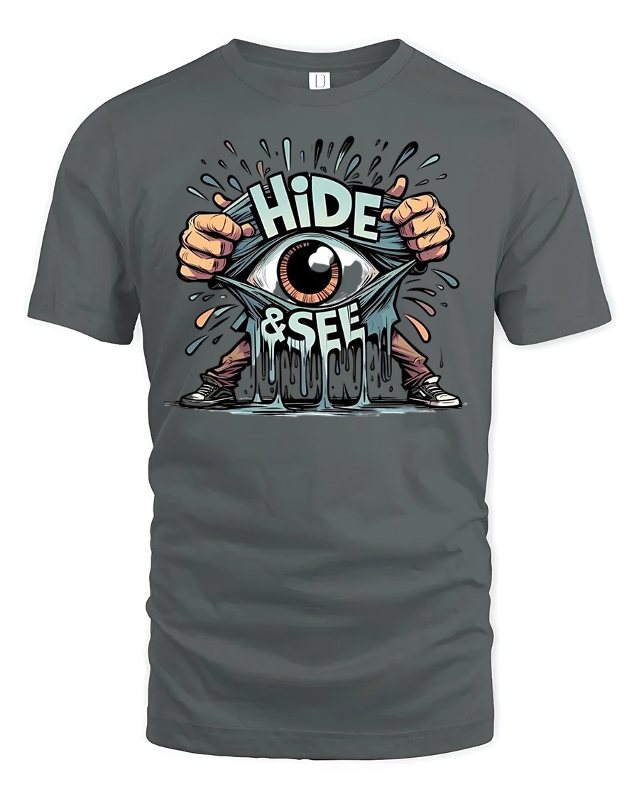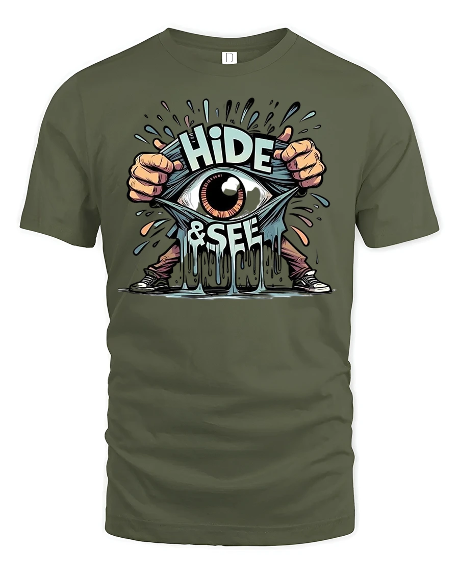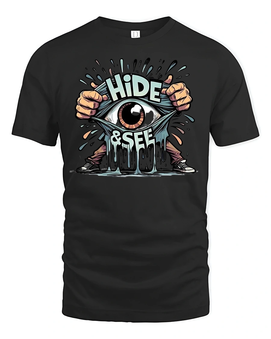 Hide and Seek Eye Funny Graphic Creepy Cool Print Tee is perfect for those who love bold, surreal, and eye-catching fashion. Featuring a giant realistic eye hidden behind torn fabric with the words “Hide & Seek,” this tee brings a mix of creepy humor and edgy style to your wardrobe. It’s a great way to show off your love for weird art, horror vibes, and playful creativity.