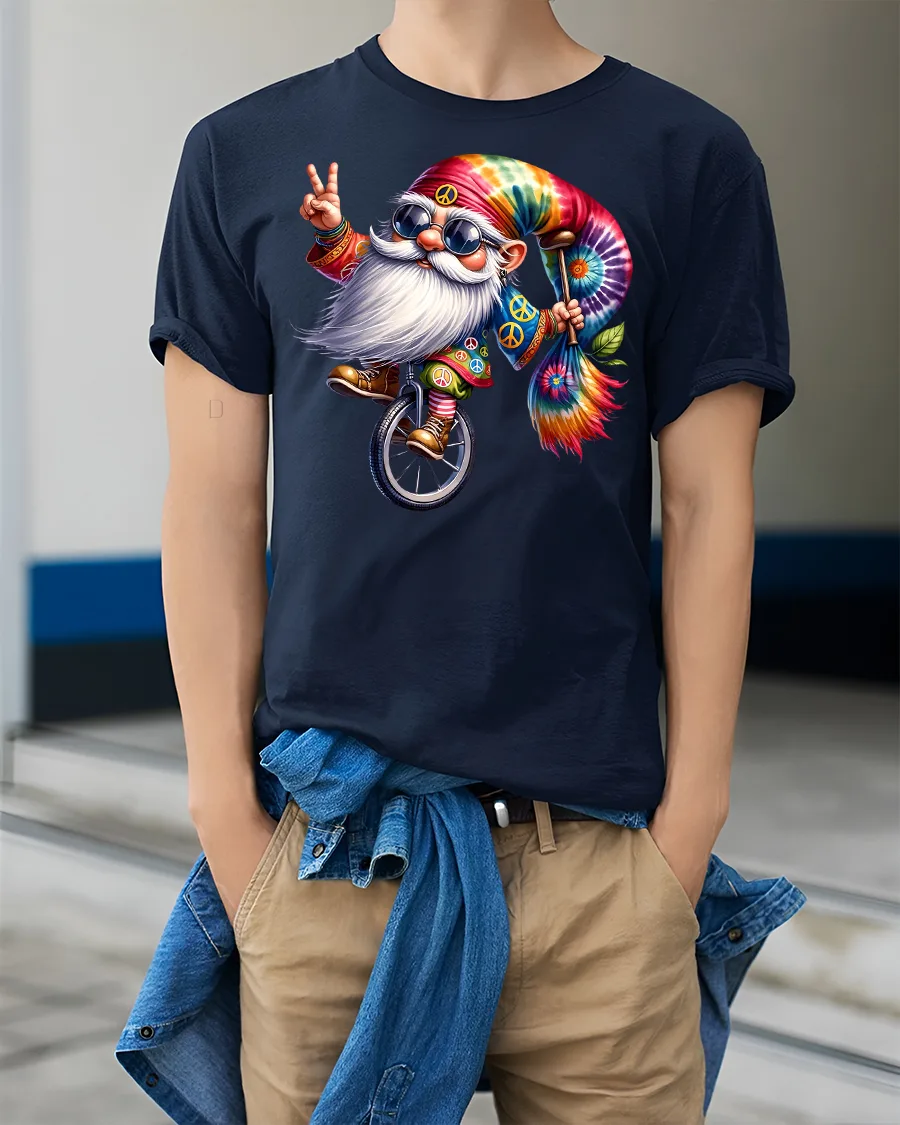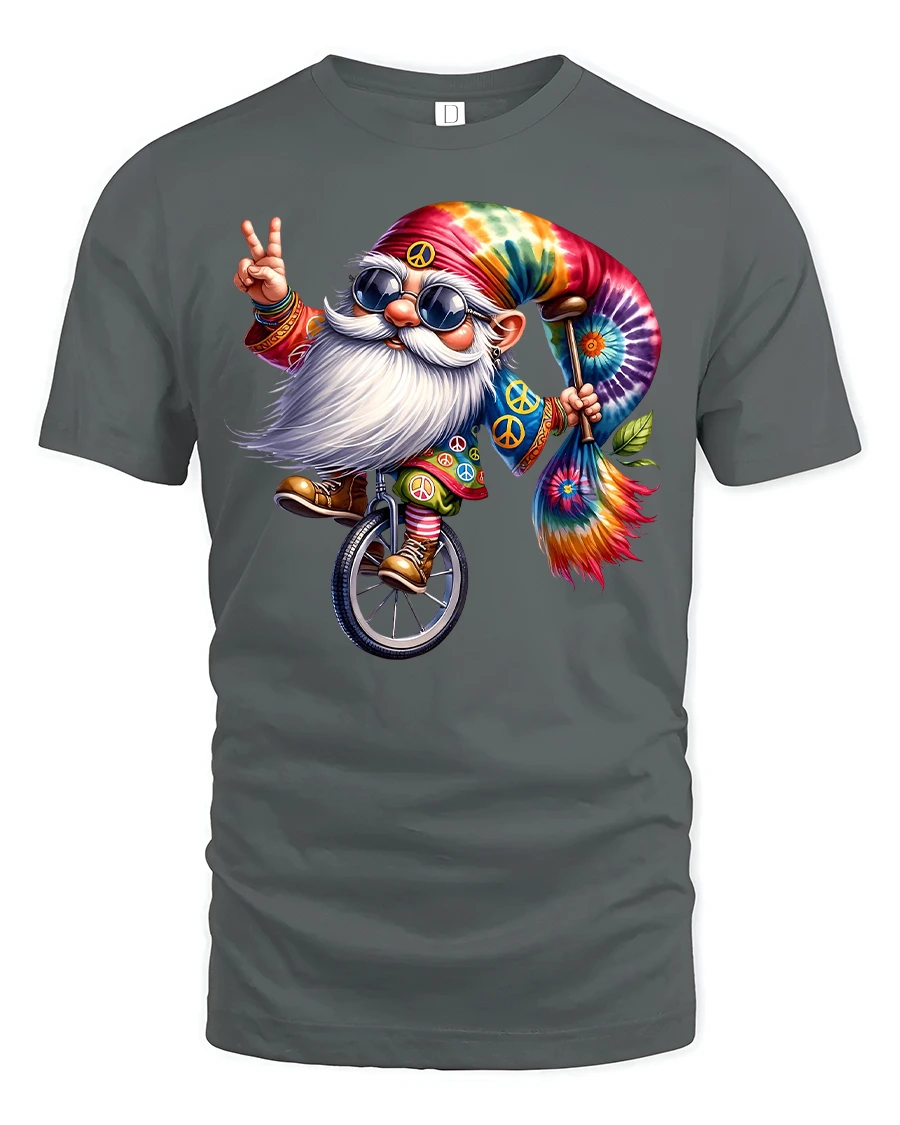 Hippie Gnome Tie-Dye Unicycle Peace Graphic Tee brings retro charm and modern humor together in one stylish shirt. Featuring a groovy gnome rocking tie-dye clothes, throwing up a peace sign, and riding a unicycle, this shirt radiates pure hippie vibes. The vibrant design and playful details make it a perfect choice for free-spirited personalities.
