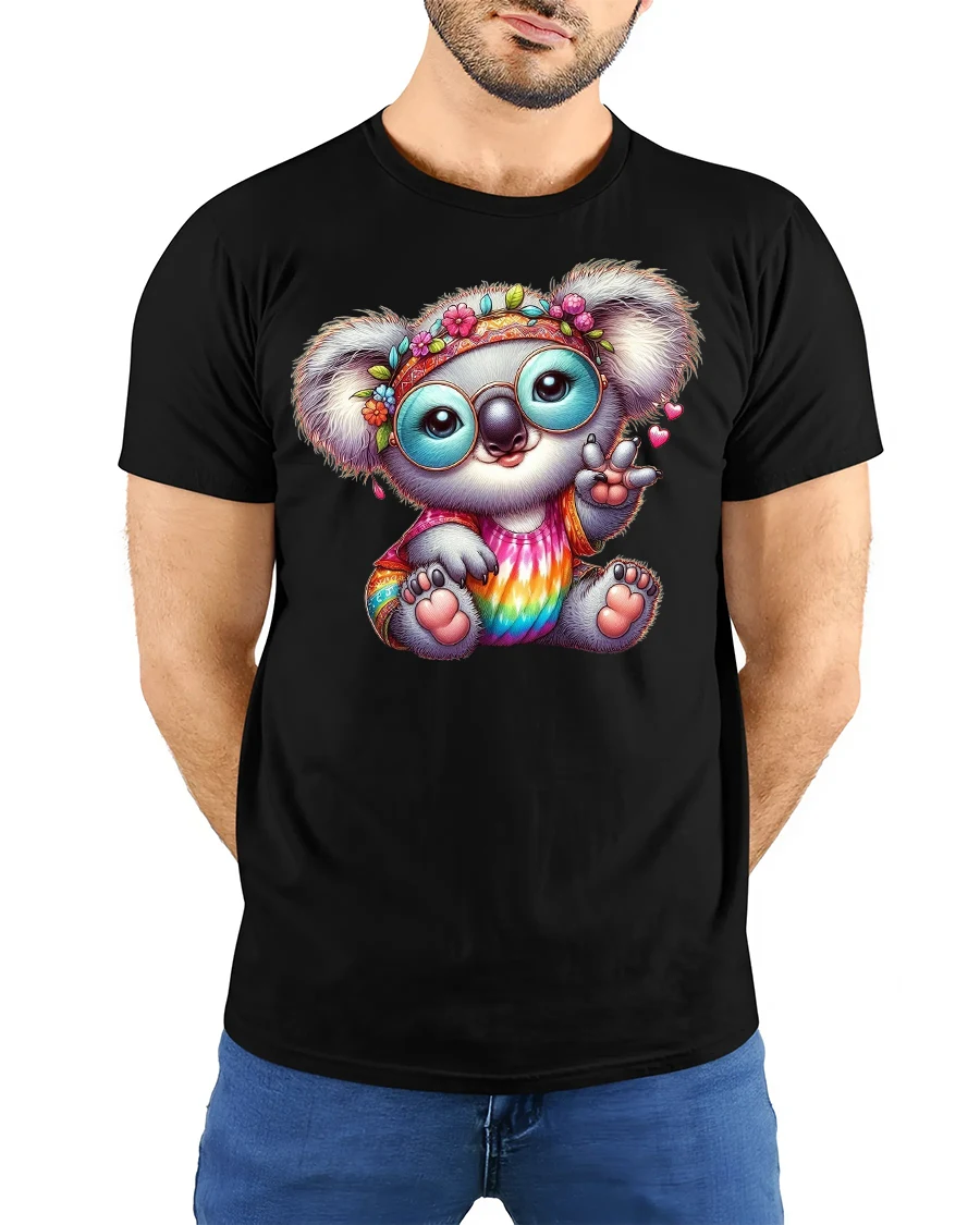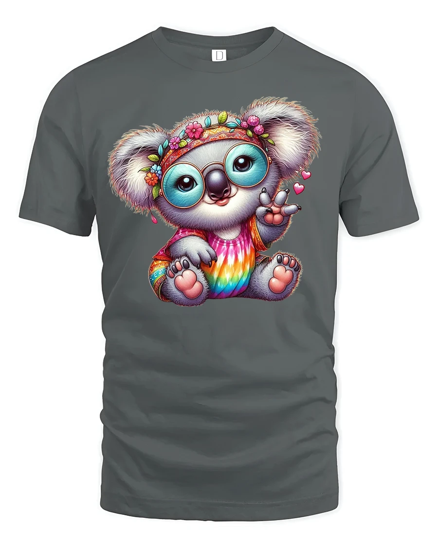 Featuring a sweet koala wearing colorful tie-dye clothes, heart-shaped glasses, and flashing a peace sign, this tee radiates positivity and fun.