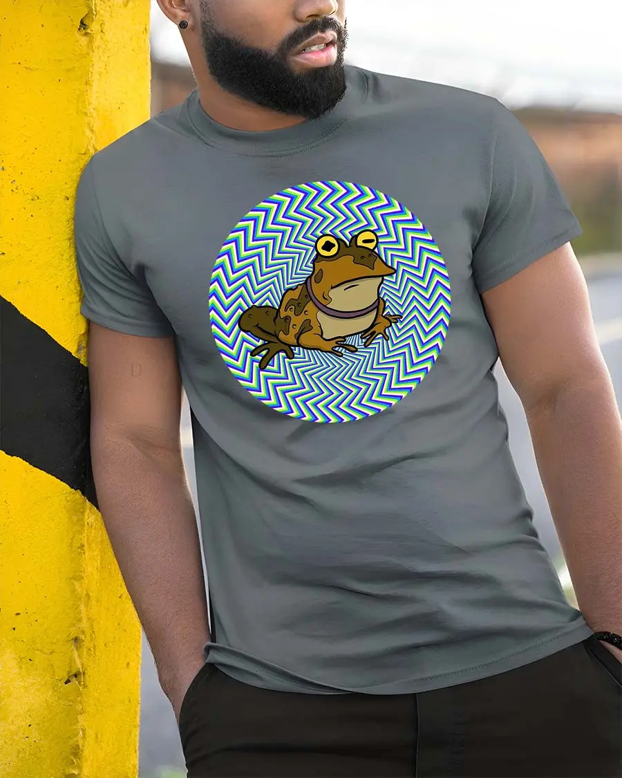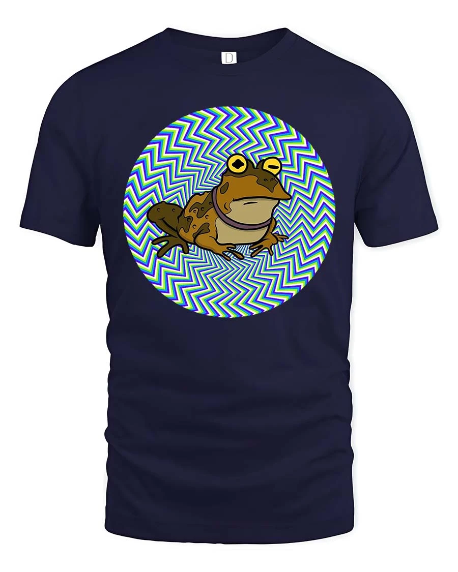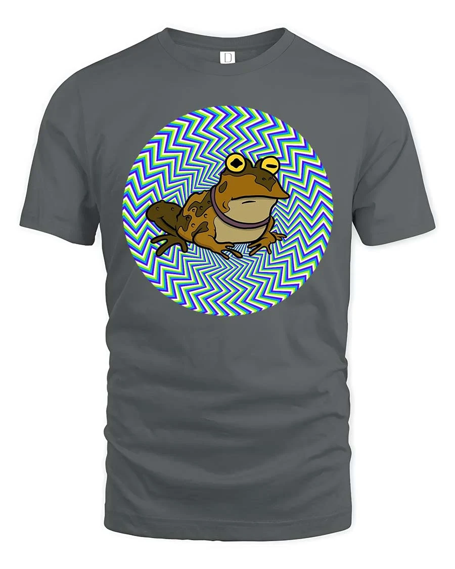 Featuring a quirky frog set against a vibrant hypnotic pattern, this t-shirt creates a visually striking and trippy effect.