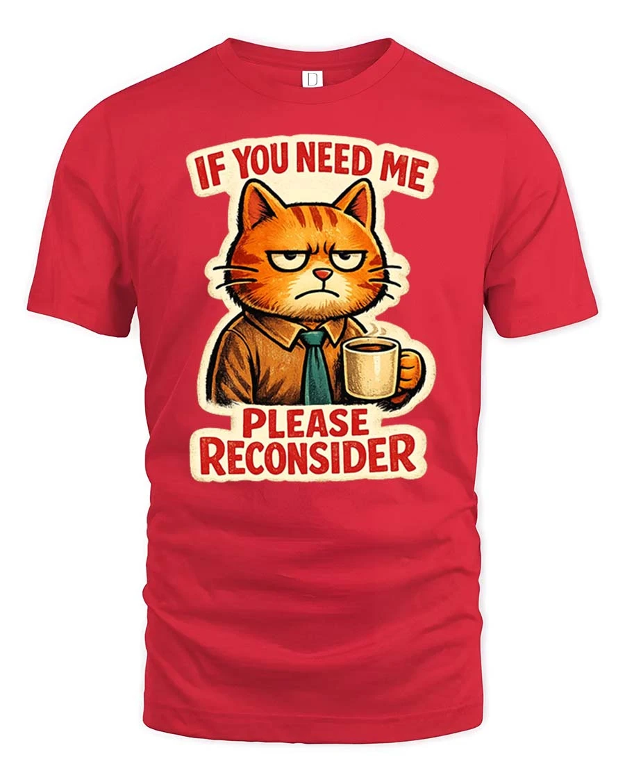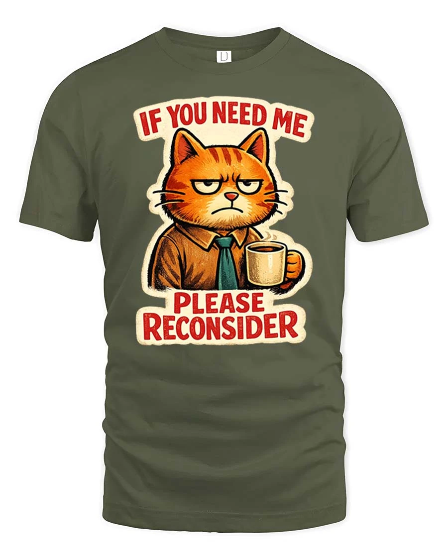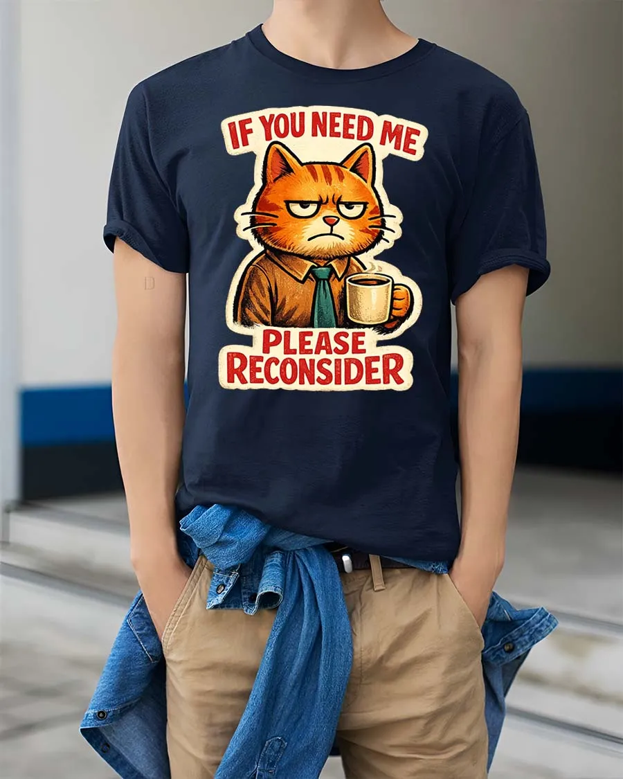If You Need Me Please Reconsider Funny Cat Graphic T-Shirt delivers a witty humorous message paired with a charming grumpy cat illustration.