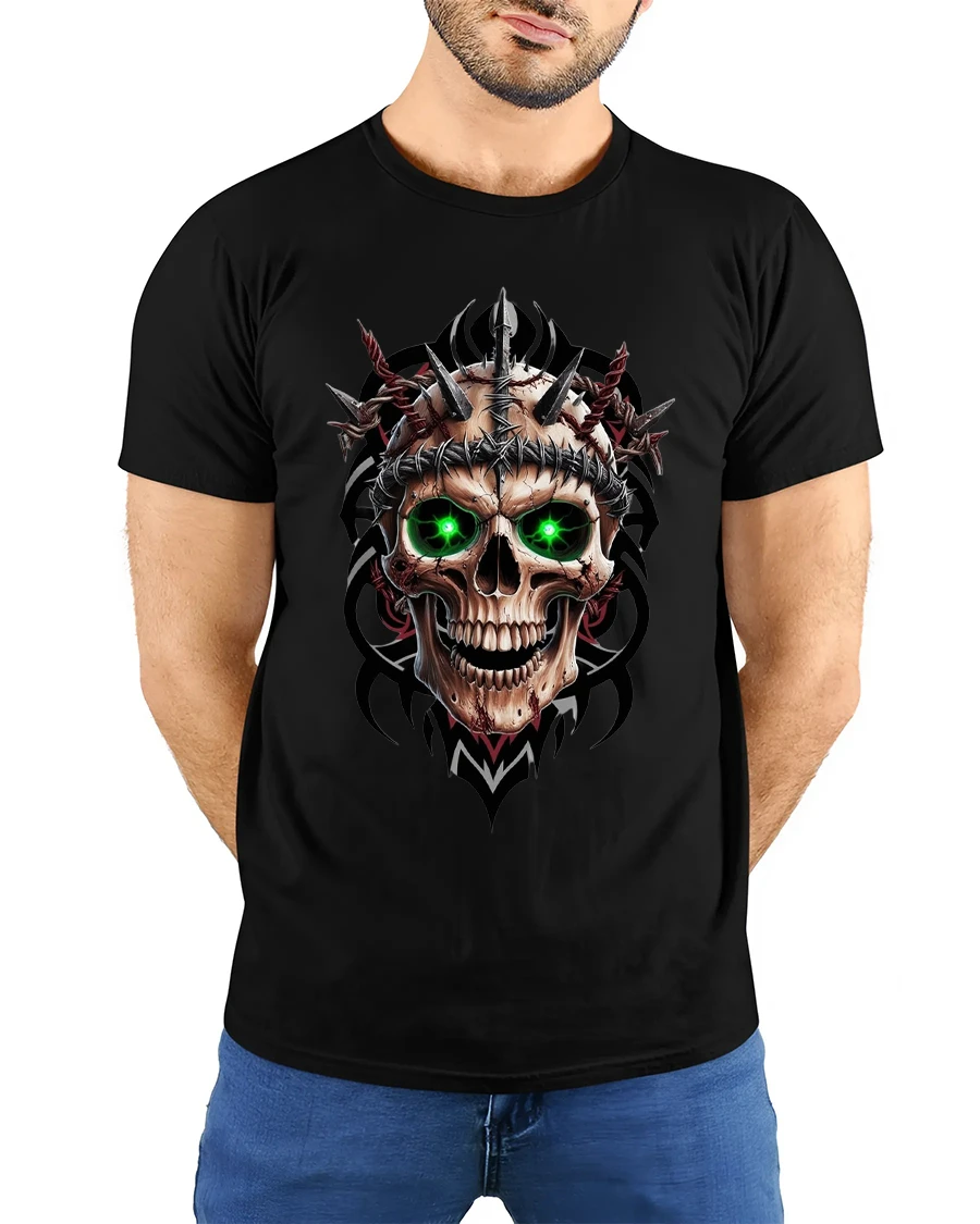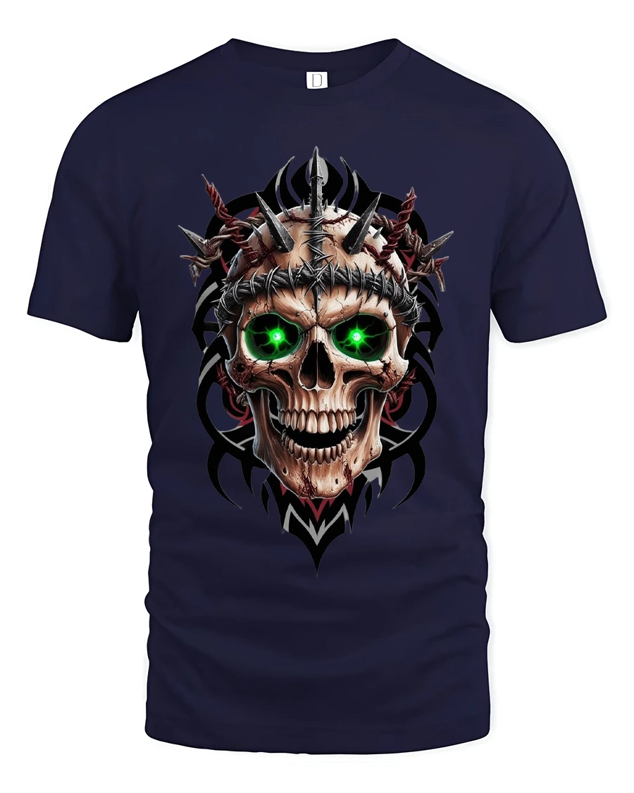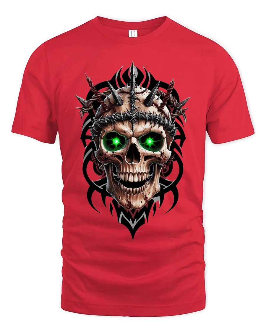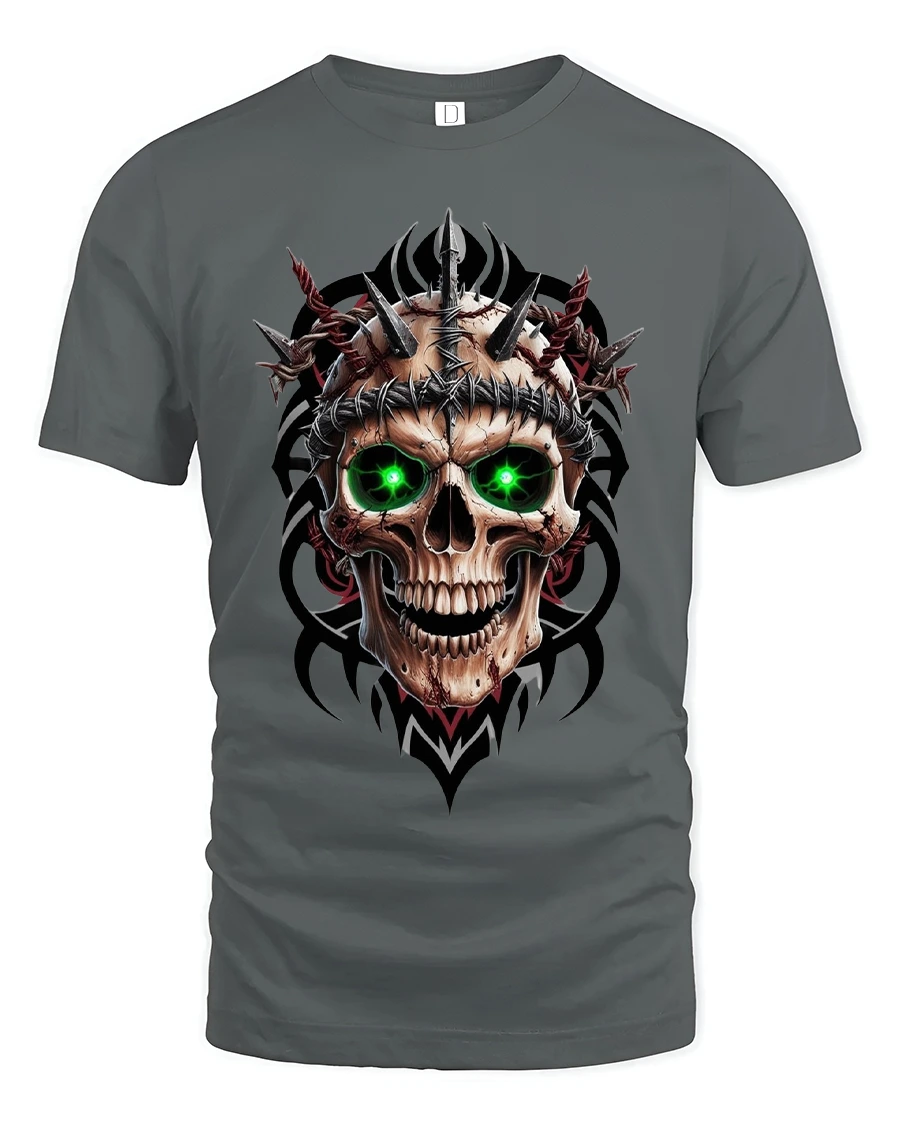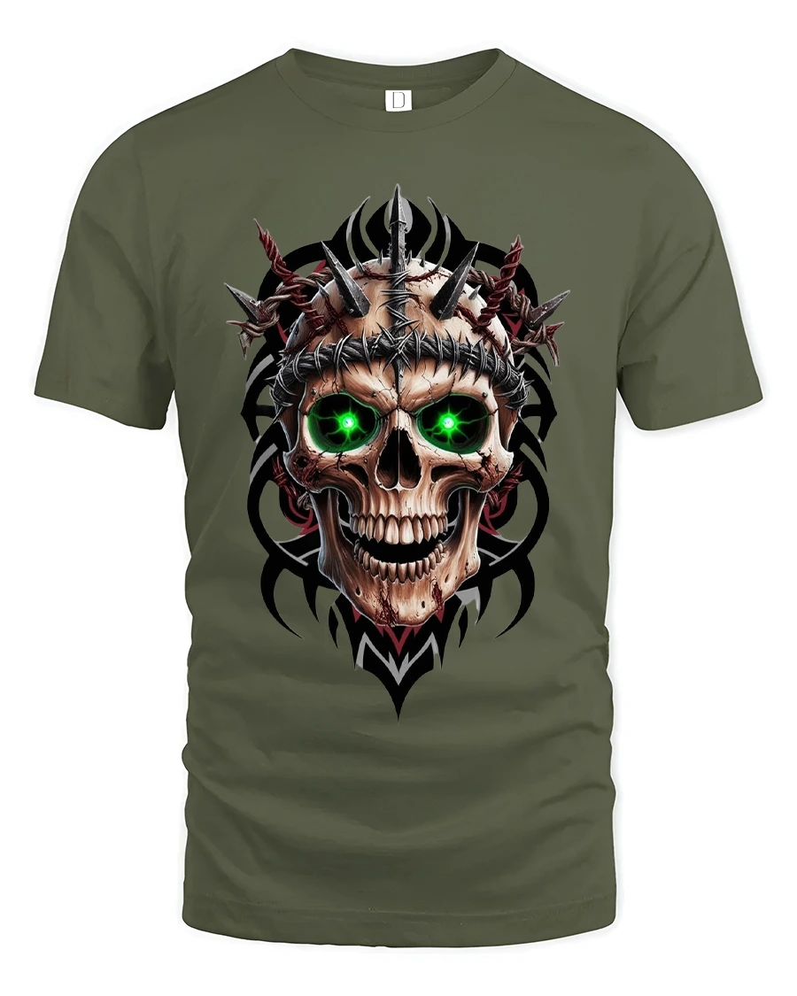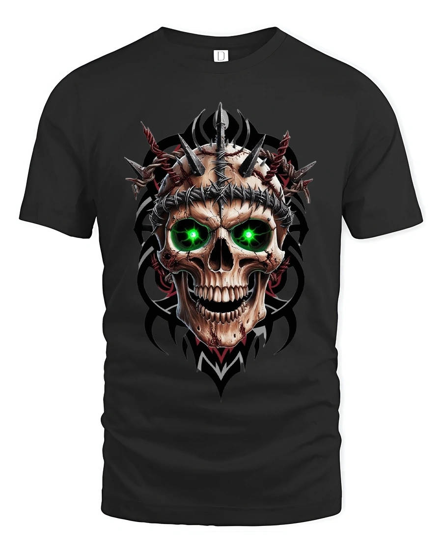 Inferno Skull Green Eyes Spiked Warrior Graphic Tee is the perfect choice for anyone who loves bold, brutal, and high-impact artwork. This fierce design features a menacing skull with glowing green eyes, wrapped in barbed wire and surrounded by sharp metallic spikes. The dark tribal accents add depth and intensity, making the entire piece feel powerful, aggressive, and unforgettable.