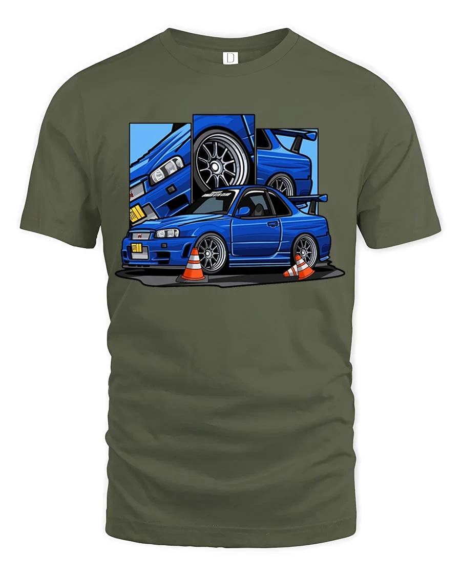 The JDM Blue Skyline Sports Car Drift Racing T-Shirt features a bold illustration of a classic Japanese tuner car surrounded by detailed automotive elements.