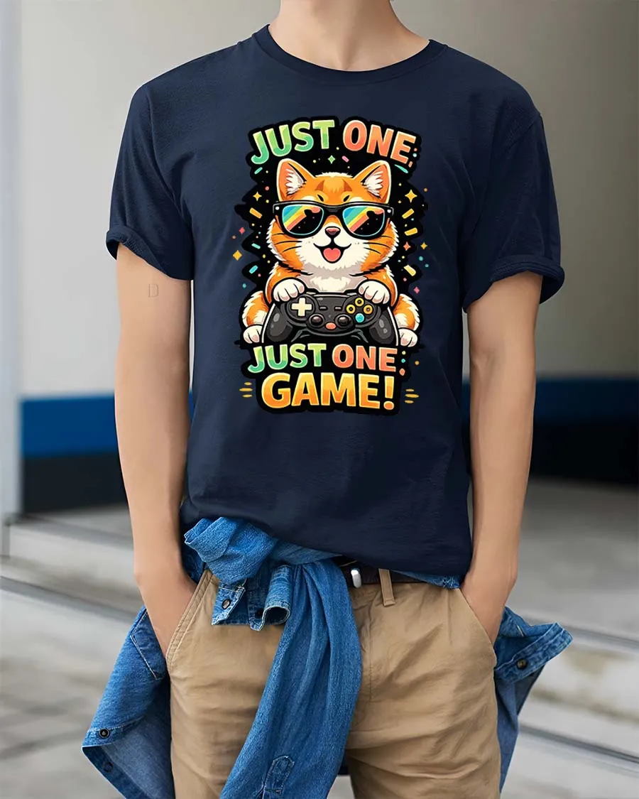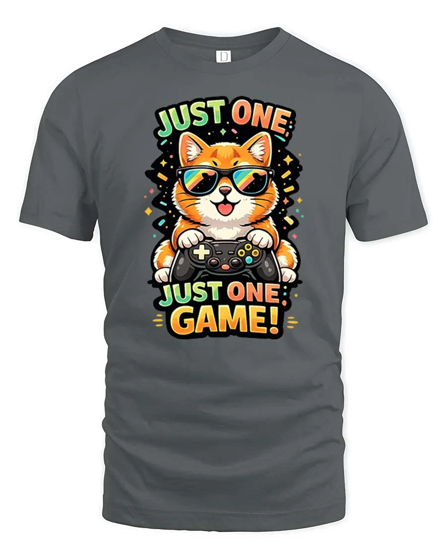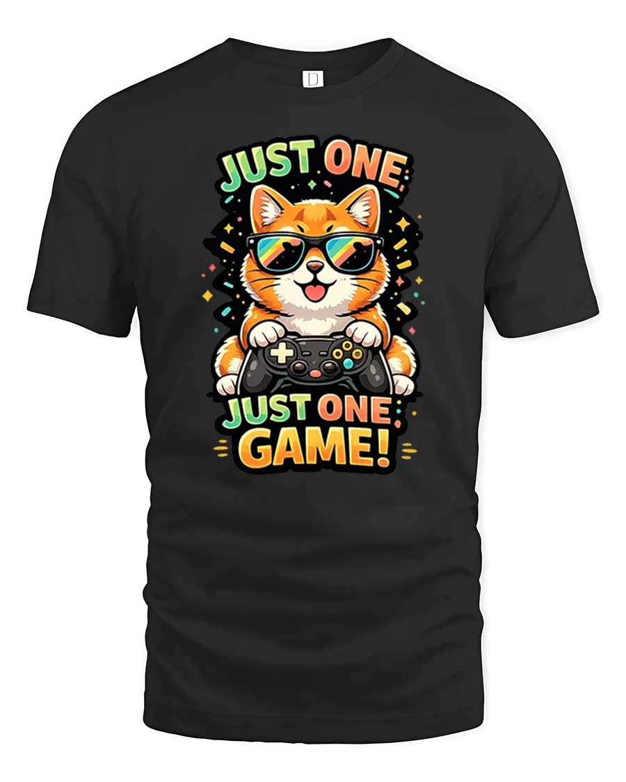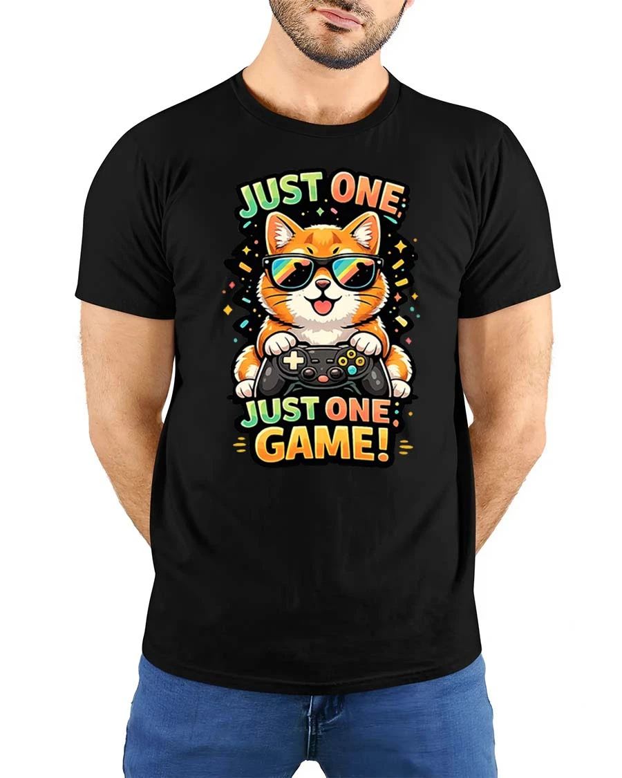 Just One Game Funny Gamer Cat Cartoon Graphic T-Shirt blends comfort creativity and playful style effortlessly.
