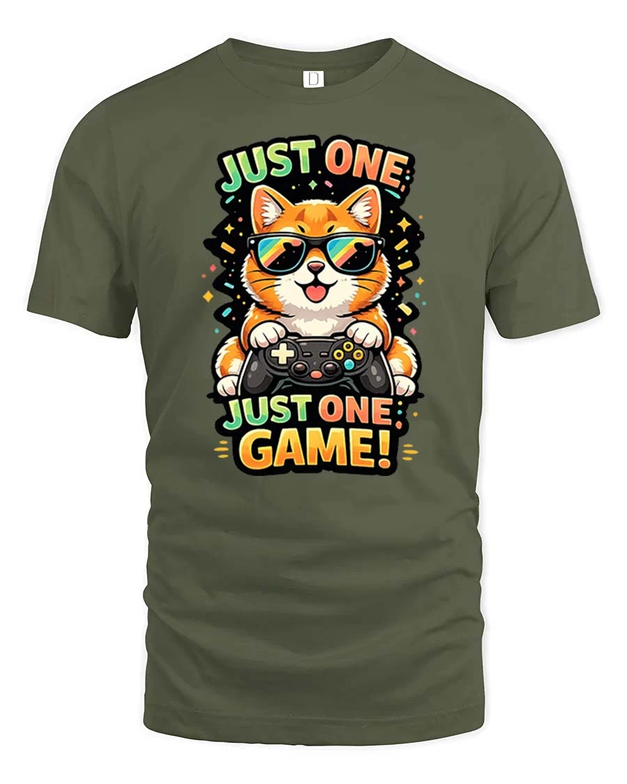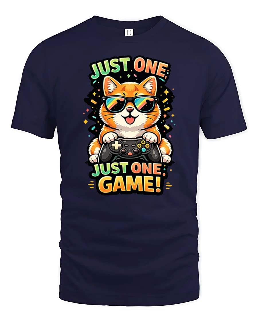 Just One Game Funny Gamer Cat Cartoon Graphic T-Shirt features a playful cat character fully focused on gaming fun.