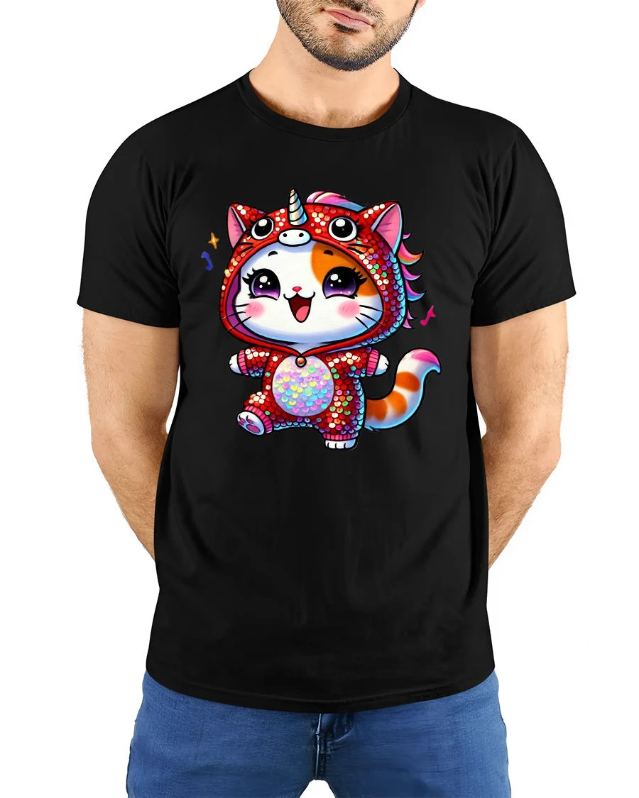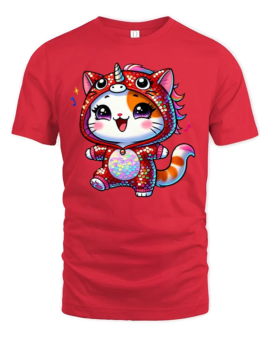 Kawaii Cat Unicorn Onesie Rainbow Sparkle Cute Graphic Tee is the perfect choice for anyone who loves bright colors, adorable characters, and fun fantasy vibes. This charming design features a happy kitty wearing a sparkling red unicorn onesie, complete with a rainbow mane, horn, and shimmering sequin-style texture. The joyful expression and playful pose bring instant smiles, making this tee ideal for kids, teens, and anyone who loves cute and colorful style.