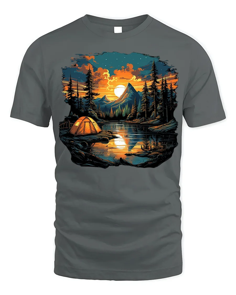 Escape to the great outdoors with our Lakeside Sunset Camping Tee. This breathtaking t-shirt features a picturesque scene of a illuminated tent pitched by a calm lake, reflecting a vibrant sunset over majestic mountains and a starry sky. It’s the perfect apparel for outdoor enthusiasts, campers, hikers, or anyone who dreams of serene wilderness getaways.