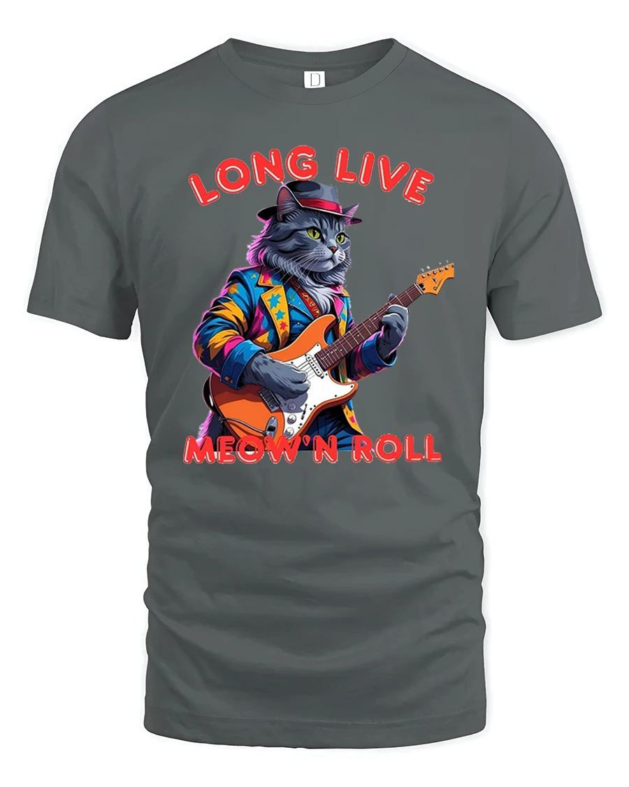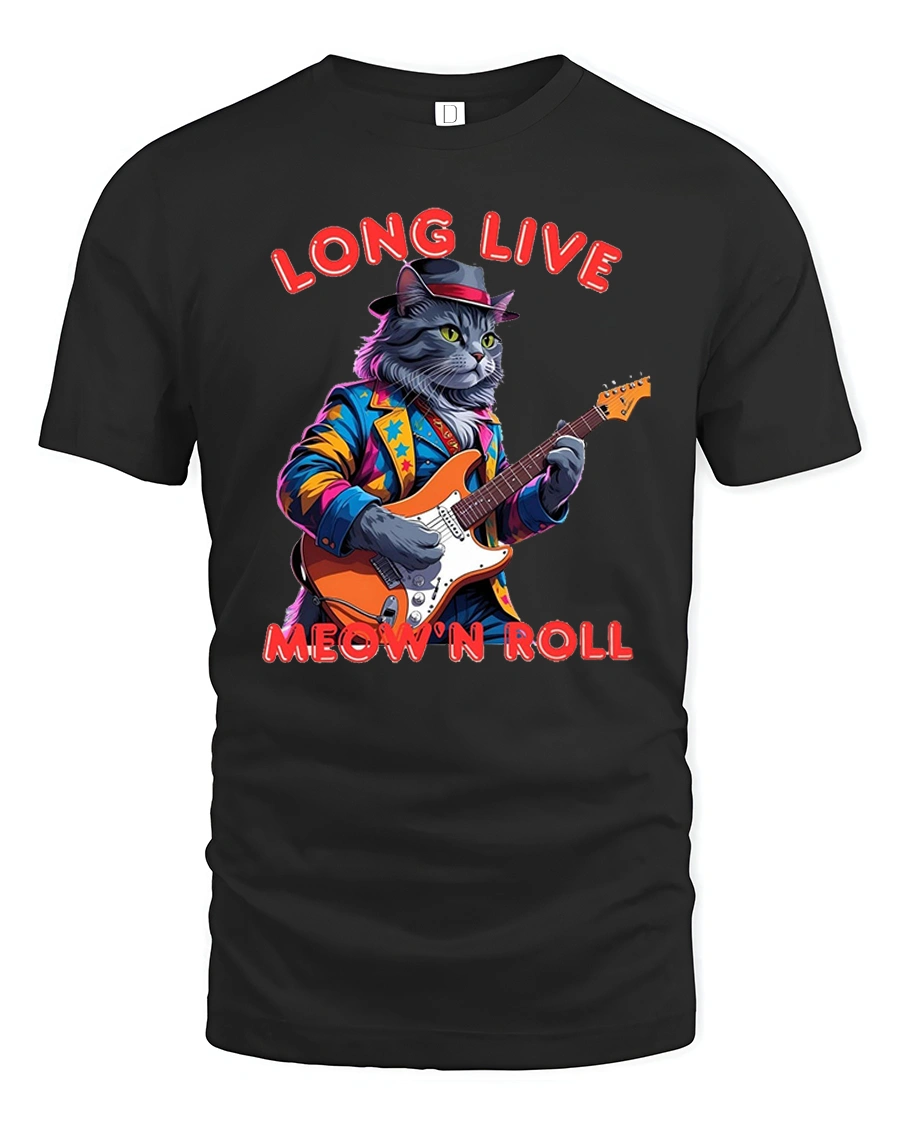 The Long Live Meow N Roll Rockstar Cat Playing Guitar Graphic Tee delivers pure feline attitude and rockstar energy in one bold design. Featuring a stylish cat dressed in a colorful retro suit shredding an electric guitar this tee captures the perfect mix of humor music culture and artistic flair. The bright colors and expressive details make it an eye catching piece that instantly stands out.