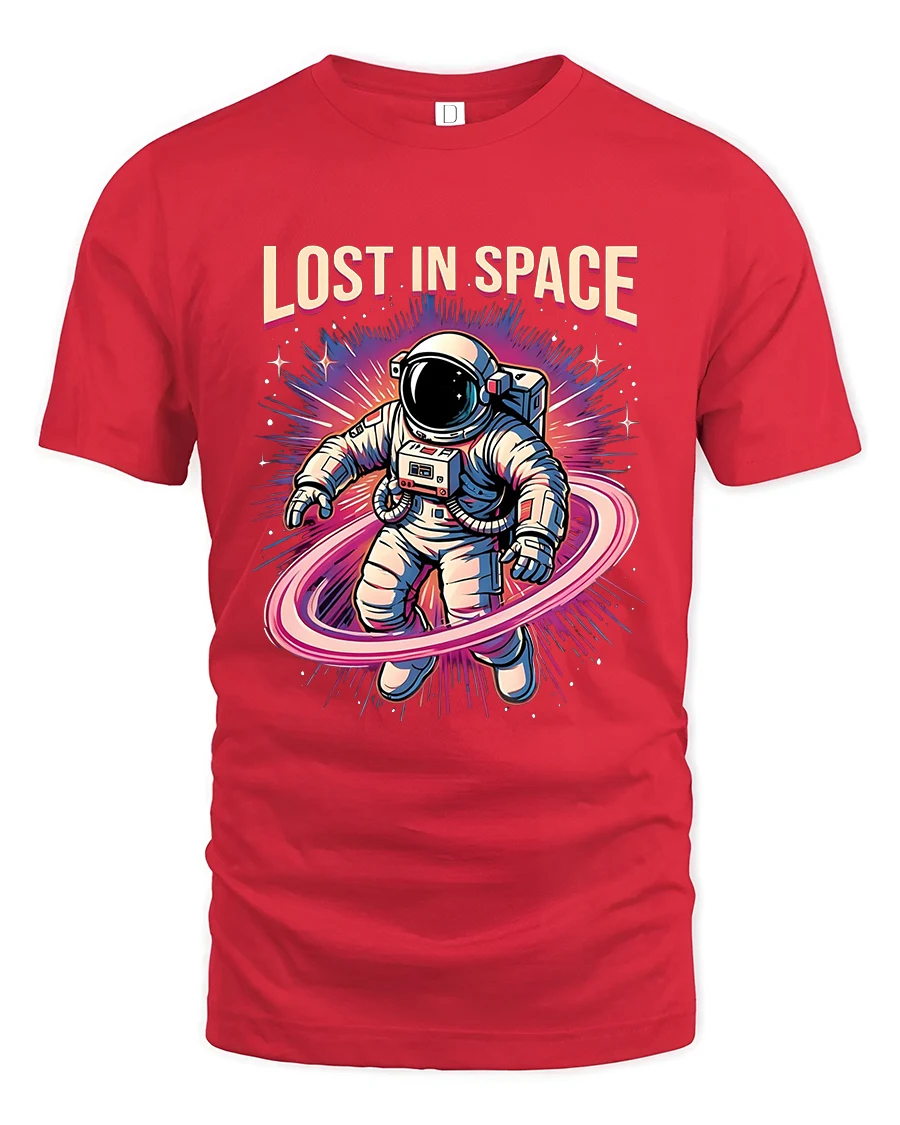 Lost In Space Astronaut Graphic Tshirt Retro Galaxy Art Tee - red t-shirt on white background