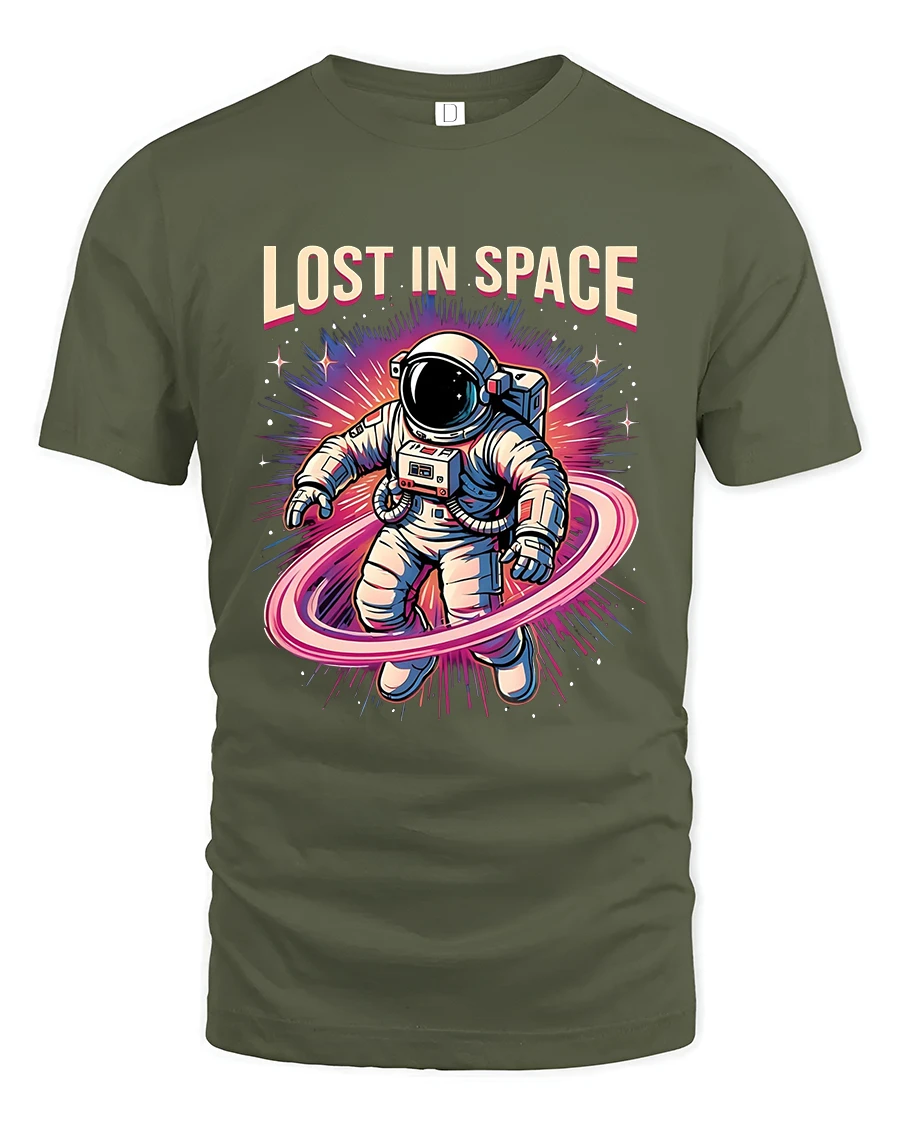 Lost In Space Astronaut Graphic Tshirt Retro Galaxy Art Tee - military green t-shirt on white background