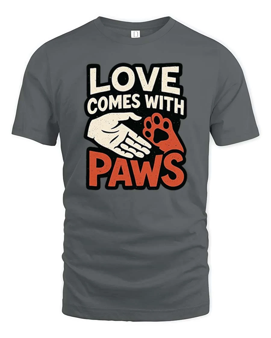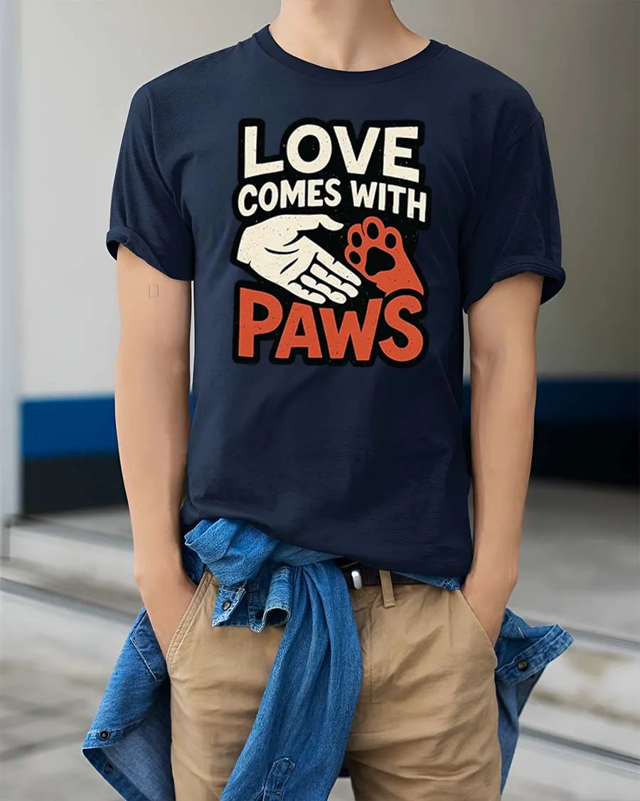 Love Comes With Paws Dog Lover Quote Graphic T-Shirt Tee expresses the heartfelt connection between people and their beloved pets through a simple meaningful design.