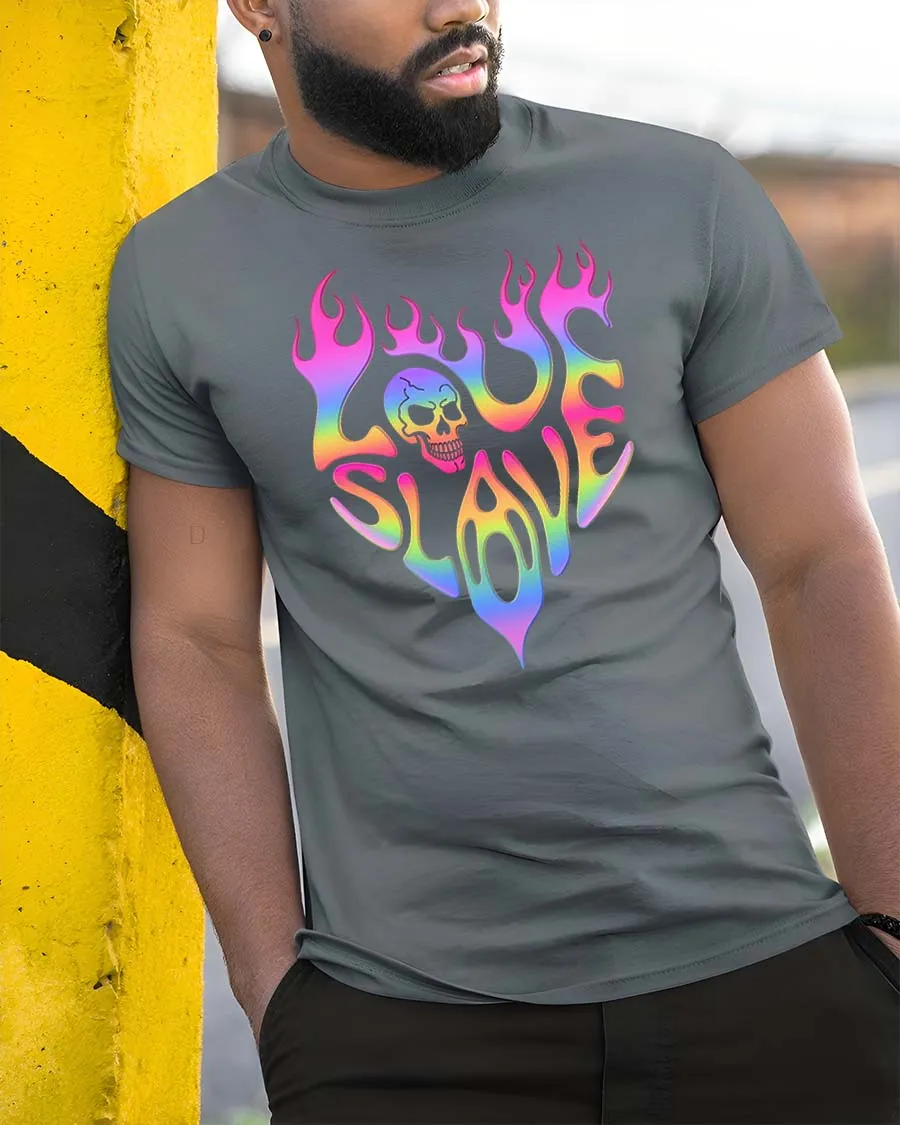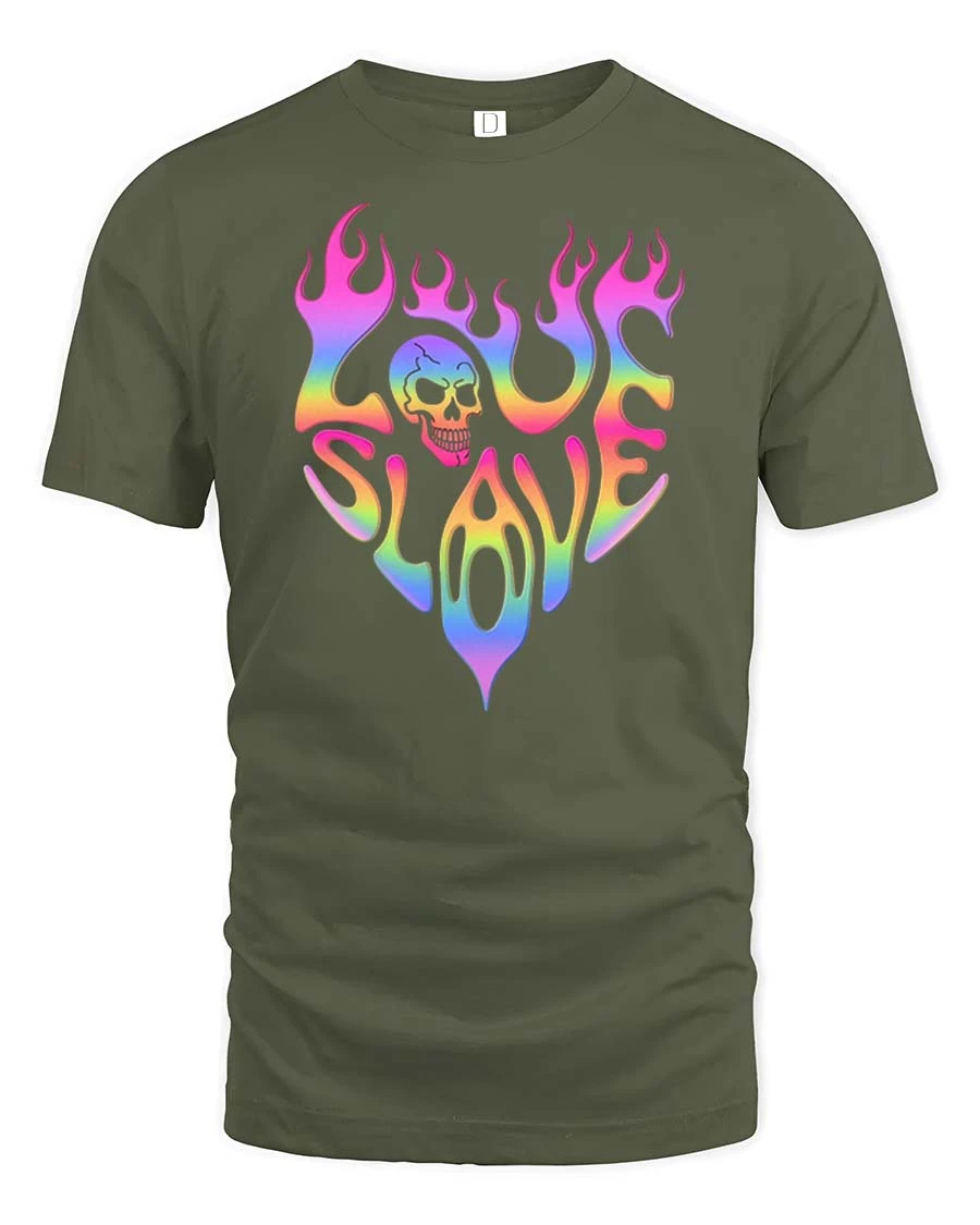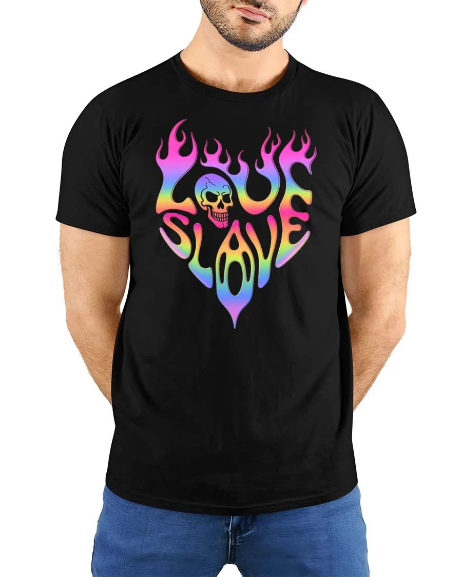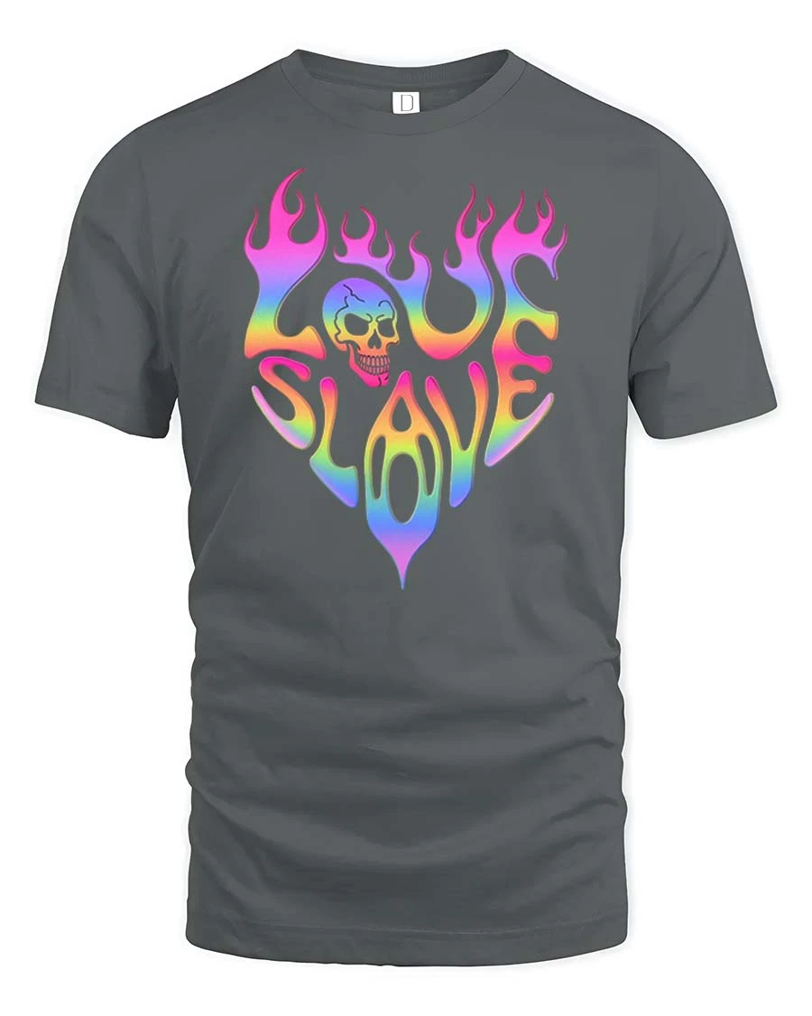 Love Slave Rainbow Flame Skull Retro Graphic T-Shirt Tee features a striking combination of psychedelic color and bold typography inspired by vintage alternative art style.