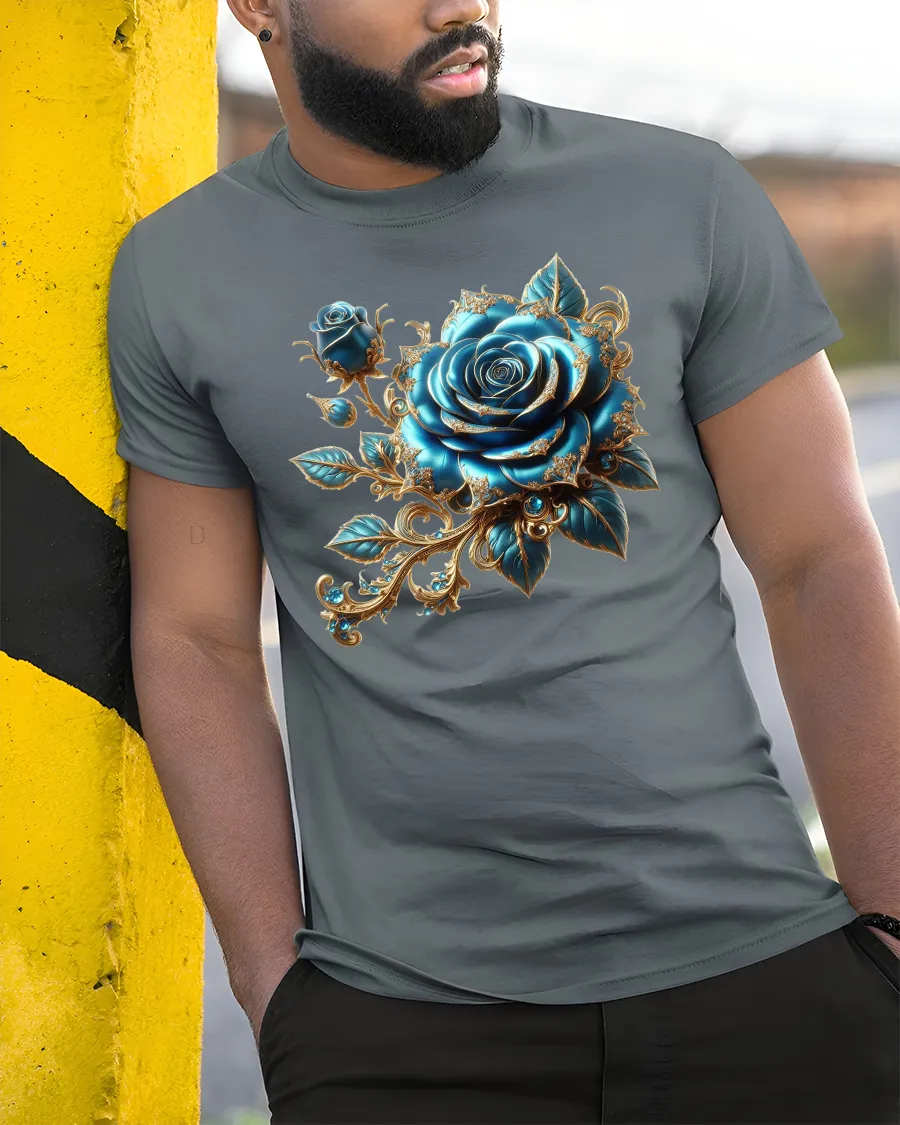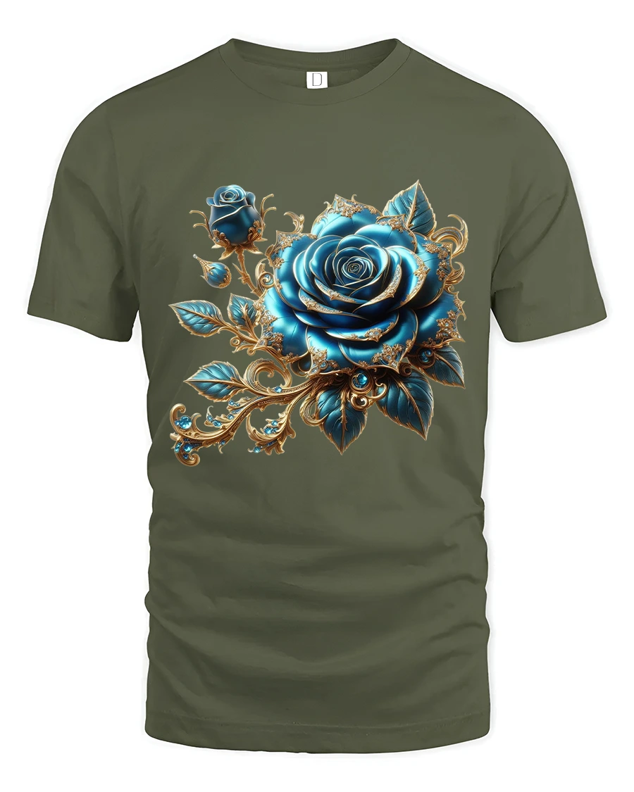Luxurious Blue Rose Baroque Floral Graphic Tee brings together timeless romance and sophisticated artistry. Featuring a richly detailed blue rose surrounded by golden ornamental swirls and elegant foliage, this design captures the charm of vintage baroque style with a modern twist. The vibrant blue tones paired with shimmering gold elements create a visually stunning piece perfect for those who appreciate refined floral artwork.
