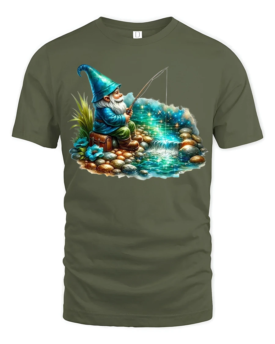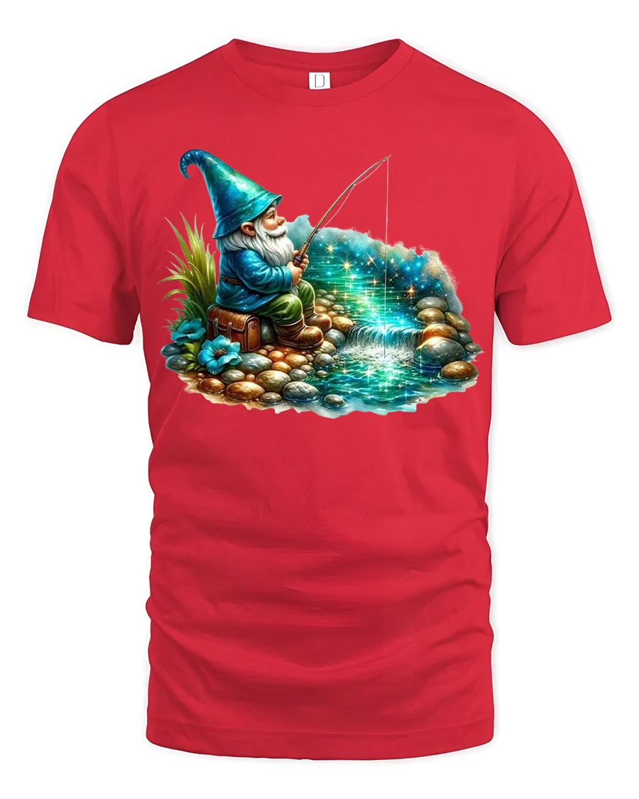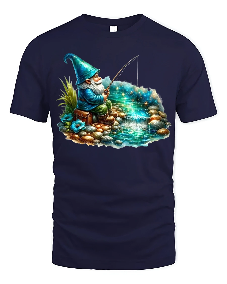 Made from a comfortable cotton blend, this gnome fishing t-shirt offers both softness and durability for daily wear. The high-quality print ensures that the vibrant details—like the glowing water, colorful stones, and enchanting gnome character—remain bold and eye-catching even after many washes. Pair it with jeans, shorts, or casual wear for a unique and fun style statement.