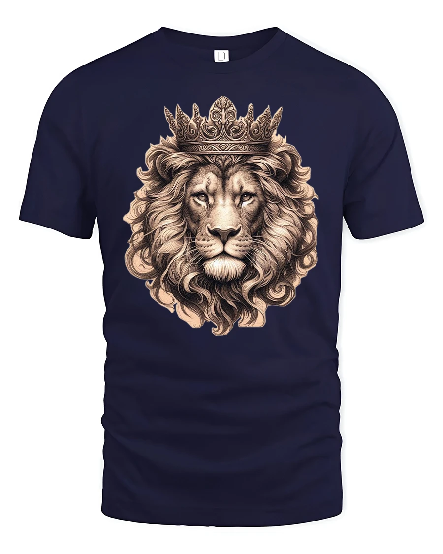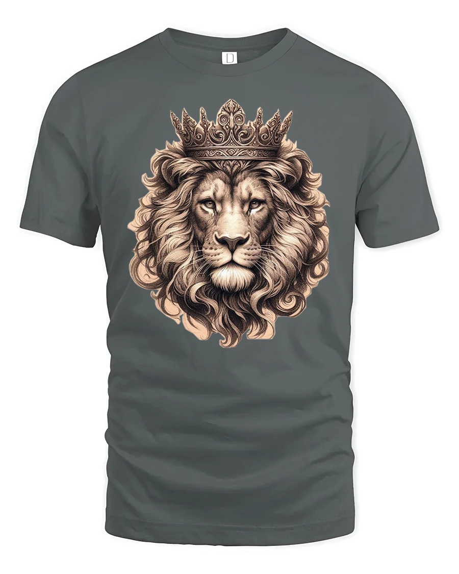 This crowned lion graphic tee showcases a highly detailed lion portrait wearing an ornate crown symbolizing leadership courage and dominance.