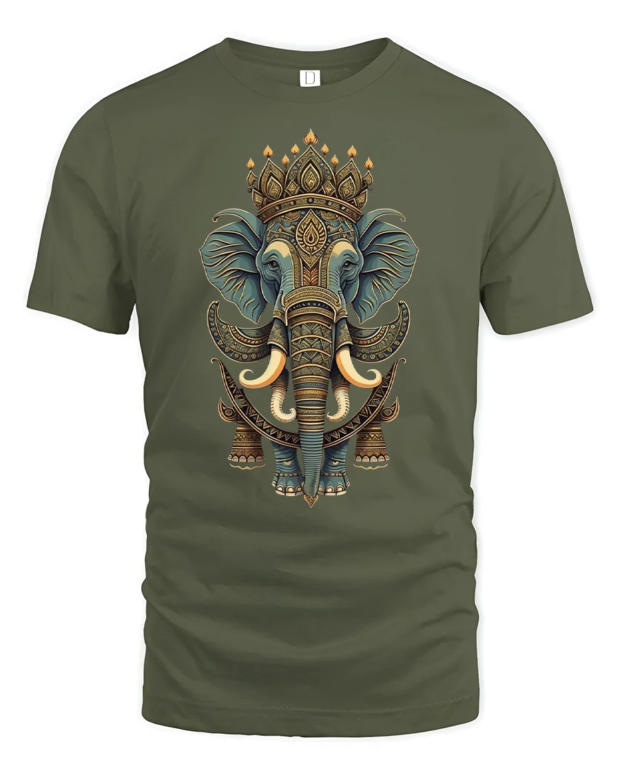This premium t-shirt features a stunning elephant head adorned with intricate mandala patterns and royal details, symbolizing balance and protection.